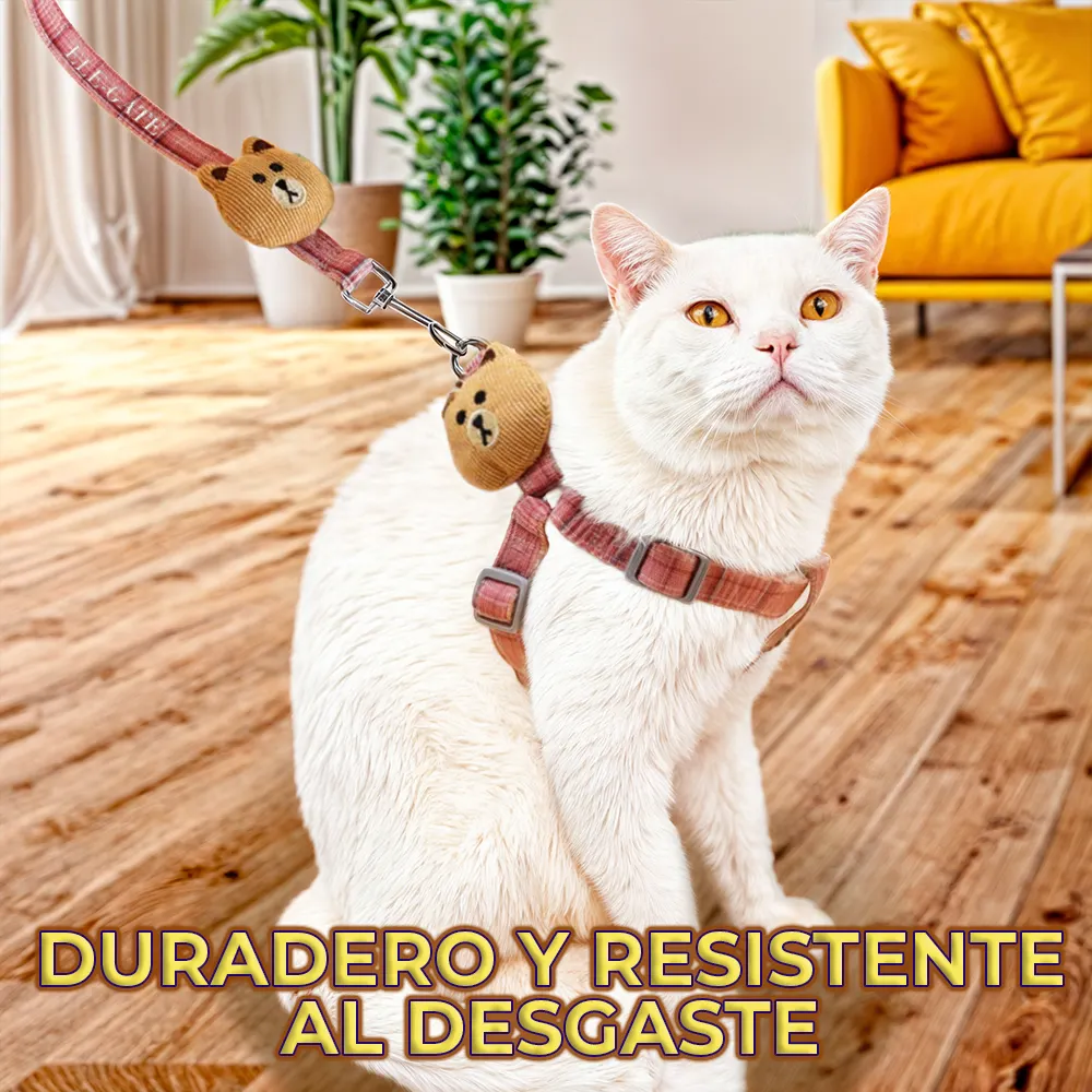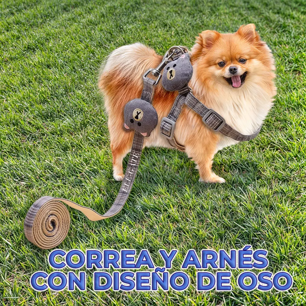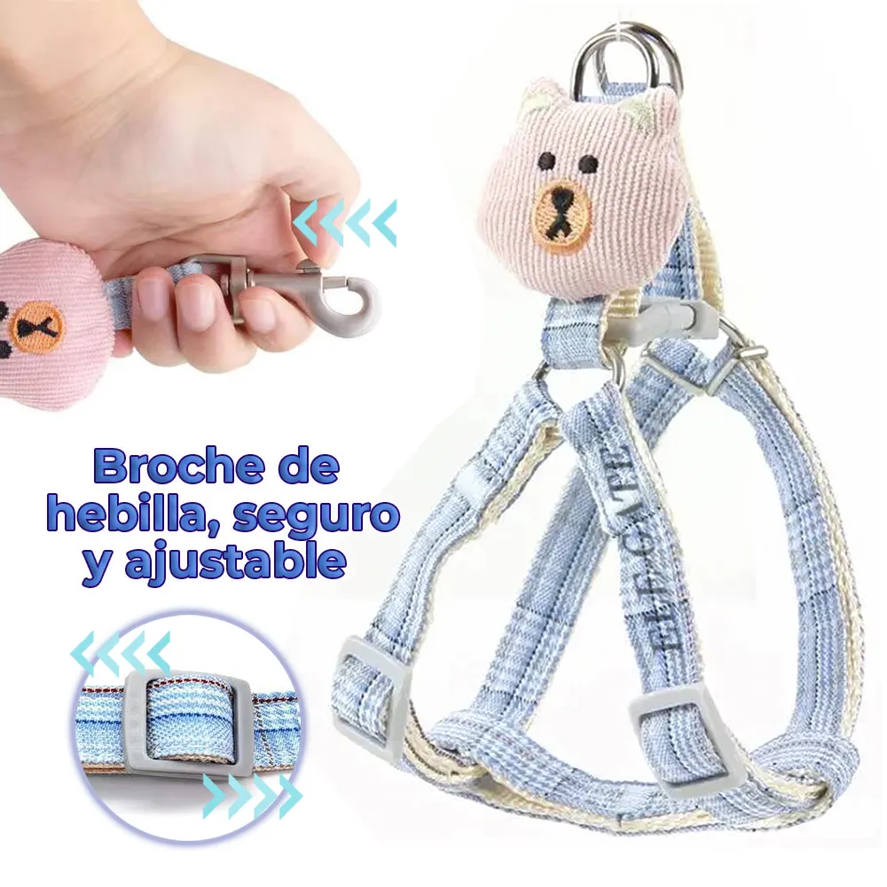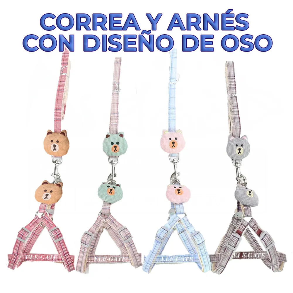 Correa y Arnés con diseño de Oso con costuras reforzadas y tamaño ideal para perro chico o gatito. Diseño Kawaii para que luzca tu mascota