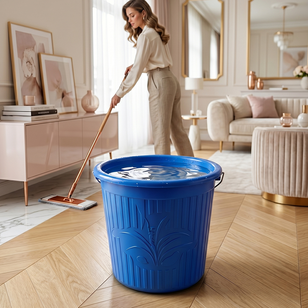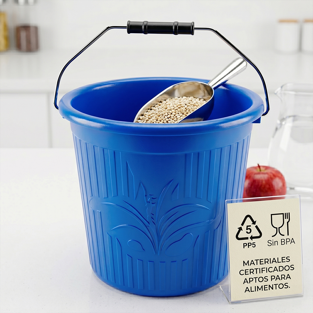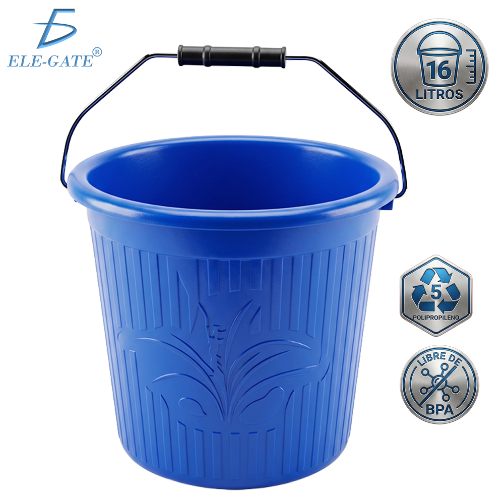 La cubeta de plástico de 16 litros está fabricada en material PP5 libre de BPA, lo que la hace segura, resistente y adecuada para múltiples usos dentro del hogar o espacios de trabajo. Su diseño en colores sólidos con relieve no solo aporta una apariencia moderna, sino que también mejora el agarre para un uso más cómodo.