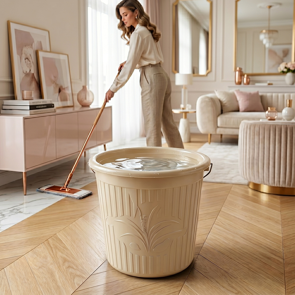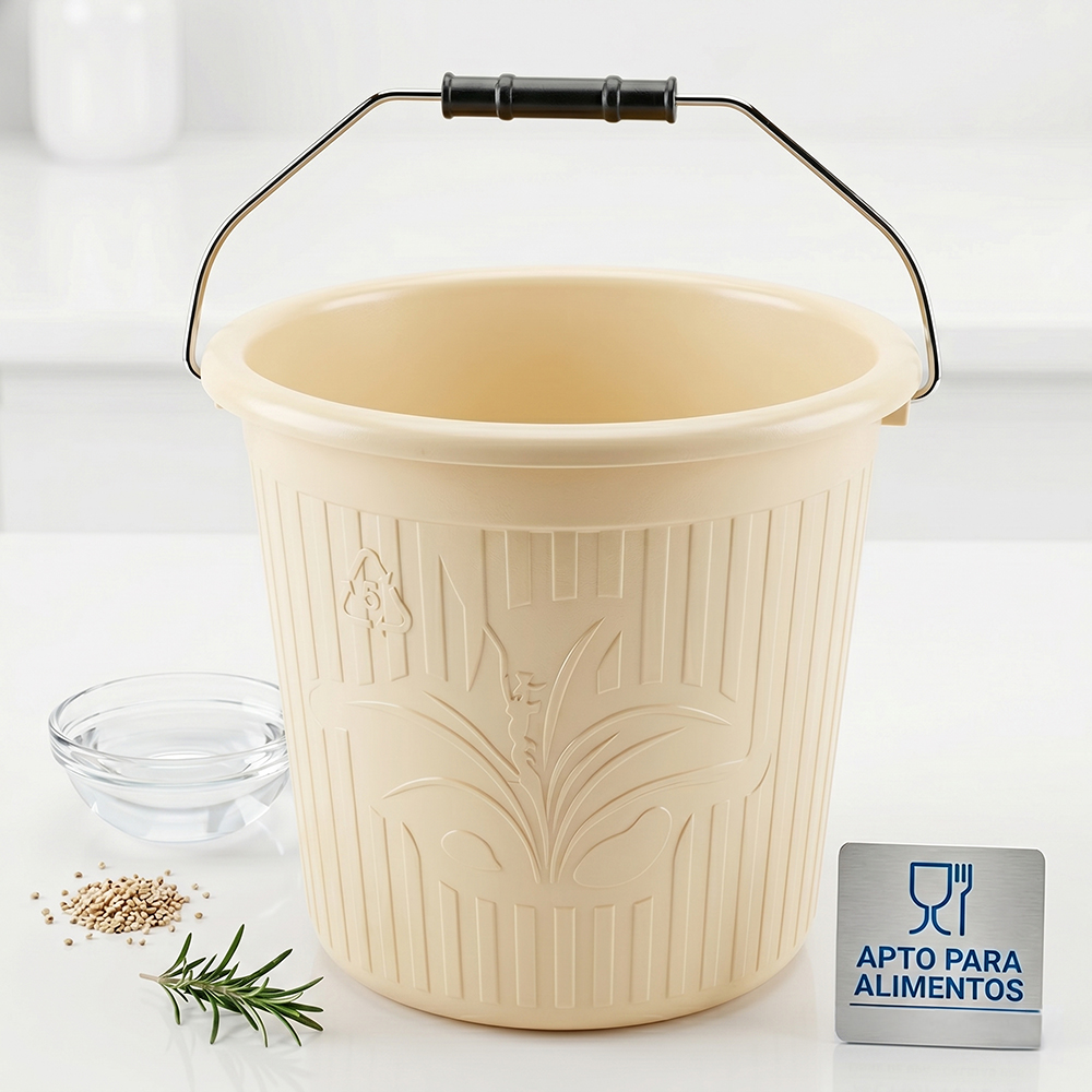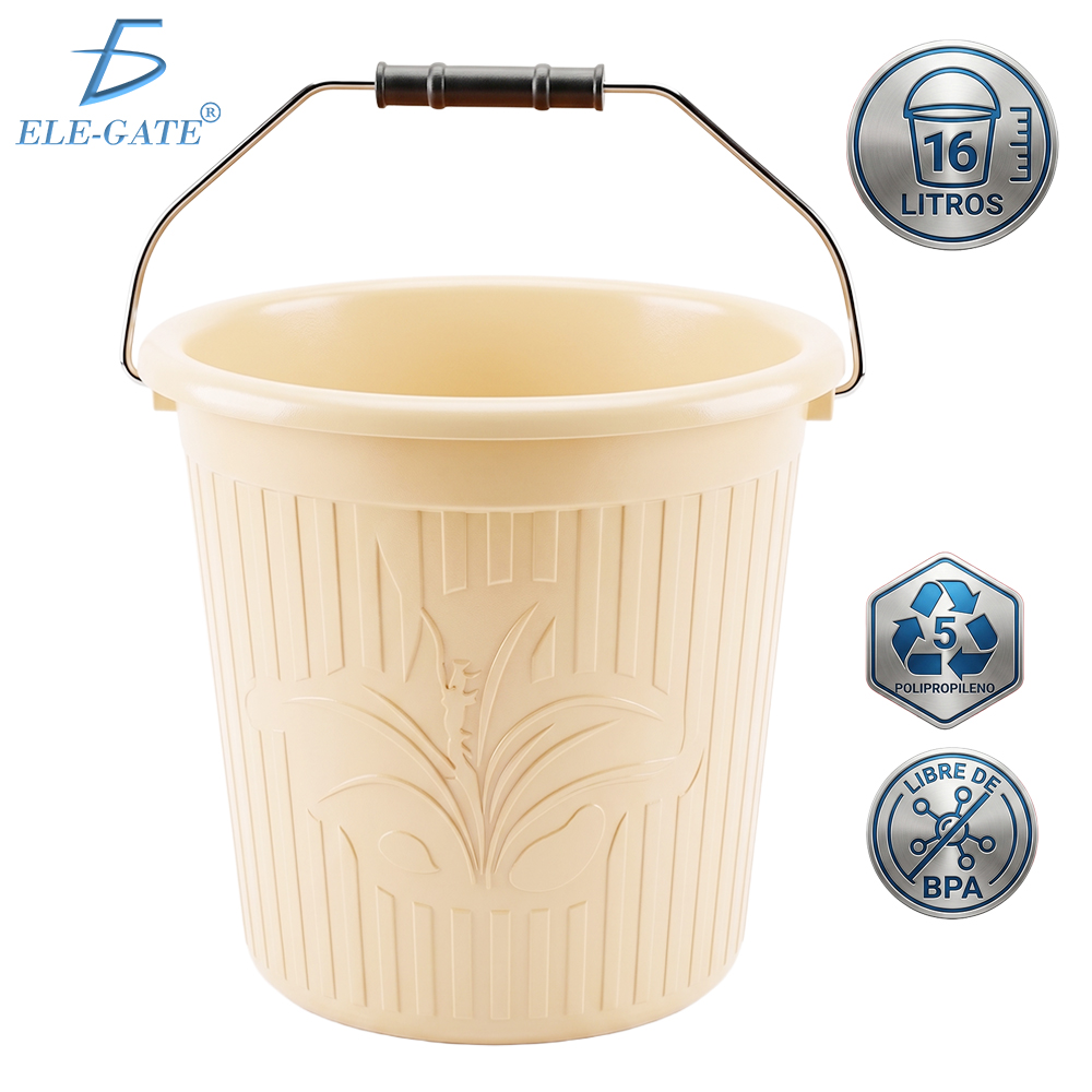 La cubeta de plástico de 16 litros está fabricada en material PP5 libre de BPA, lo que la hace segura, resistente y adecuada para múltiples usos dentro del hogar o espacios de trabajo. Su diseño en colores sólidos con relieve no solo aporta una apariencia moderna, sino que también mejora el agarre para un uso más cómodo.