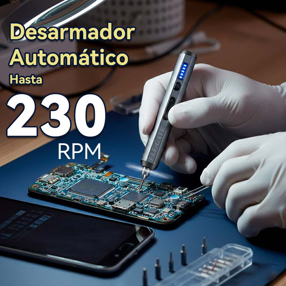 Motor automático de 230 RPM: Permite atornillar y desatornillar con rapidez y precisión, ideal para reparaciones de gadgets, celulares, laptops, relojes y más.