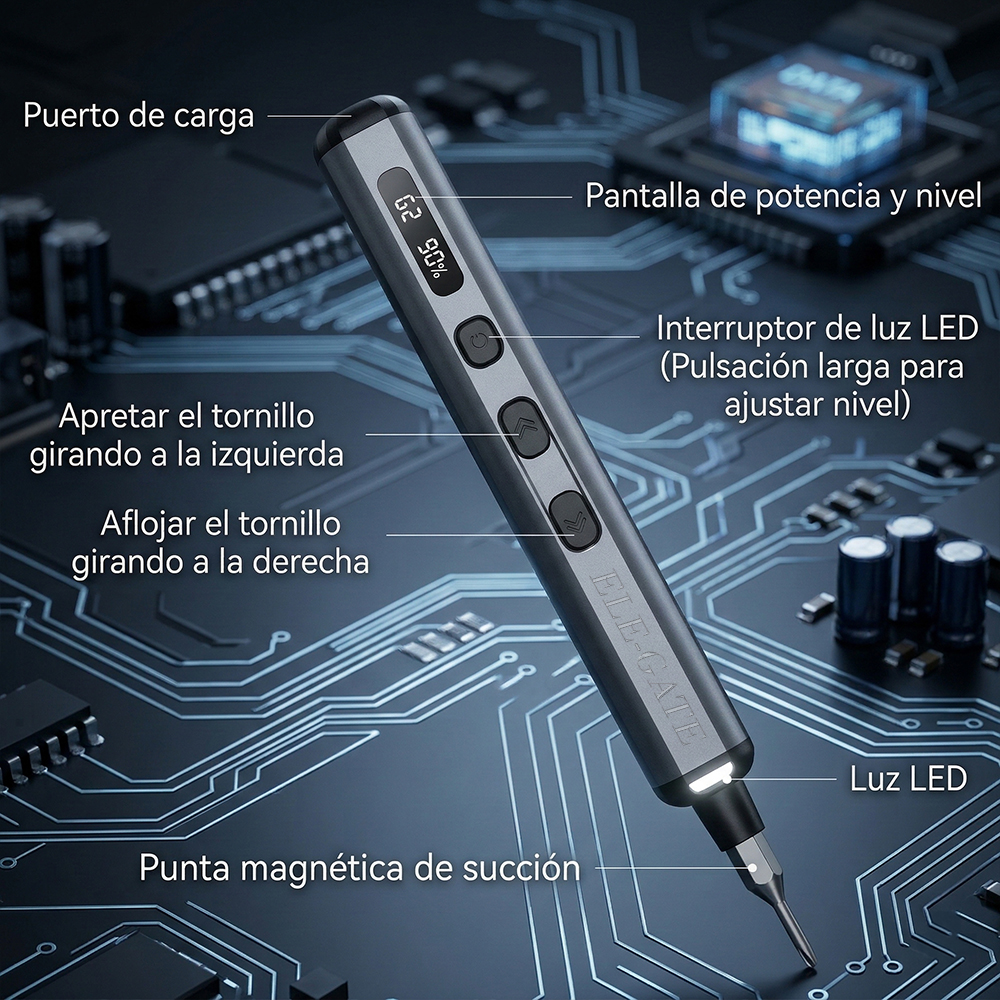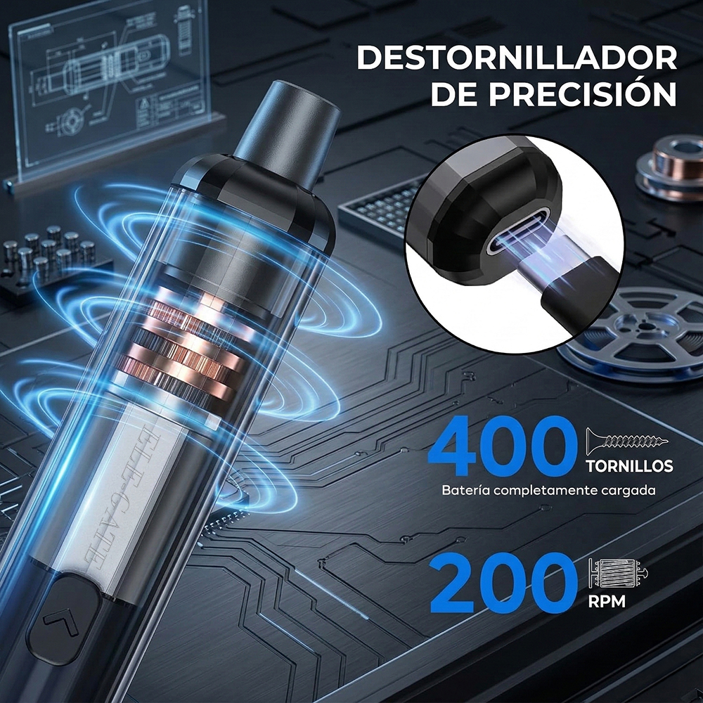 La herramienta ideal para reparaciones electrónicas y trabajos de precisión. Este destornillador eléctrico inalámbrico está diseñado para facilitar la reparación de celulares, computadoras, cámaras, relojes y otros dispositivos electrónicos. Su diseño tipo bolígrafo lo hace cómodo, ligero y fácil de usar incluso durante largos periodos.