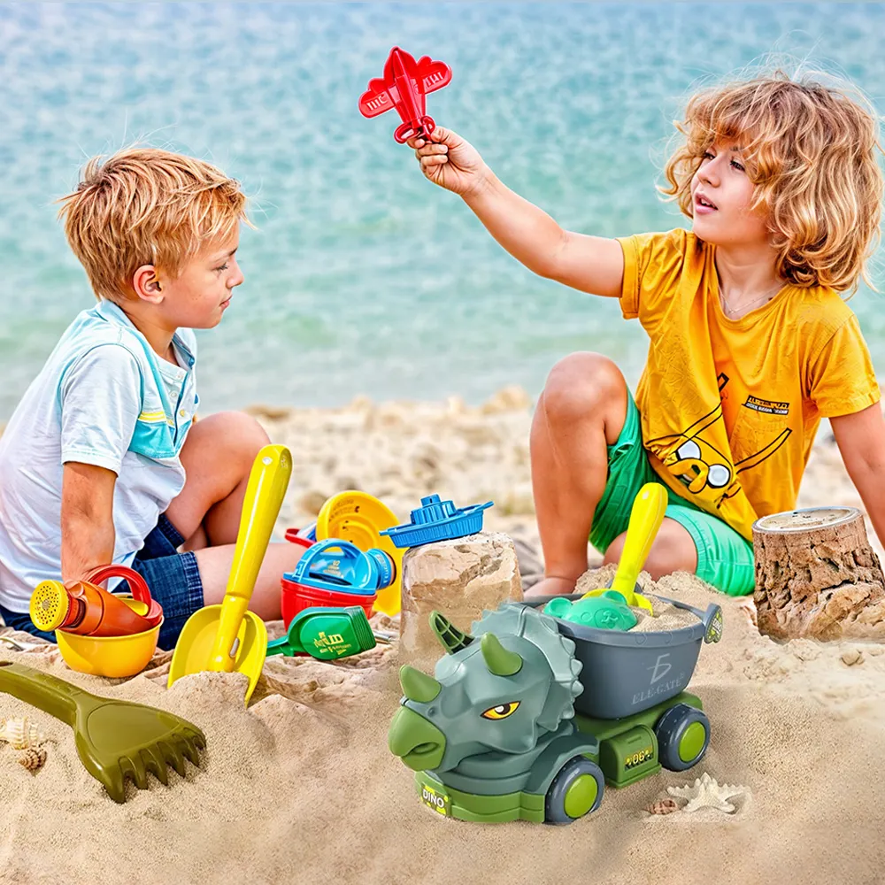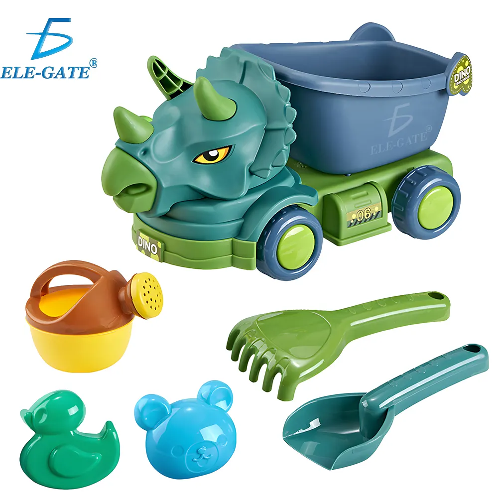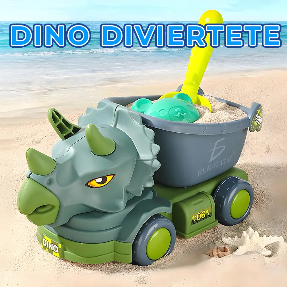 Dino Set de Playa de 6 piezas con Dino Camión con caja abatible con 2 palas, una regadera y dos moldes. Llena de emoción tus viajes con nuestro dino set, que vuele tu imaginación y juega a descubrir y desenterrar dinosaurios.