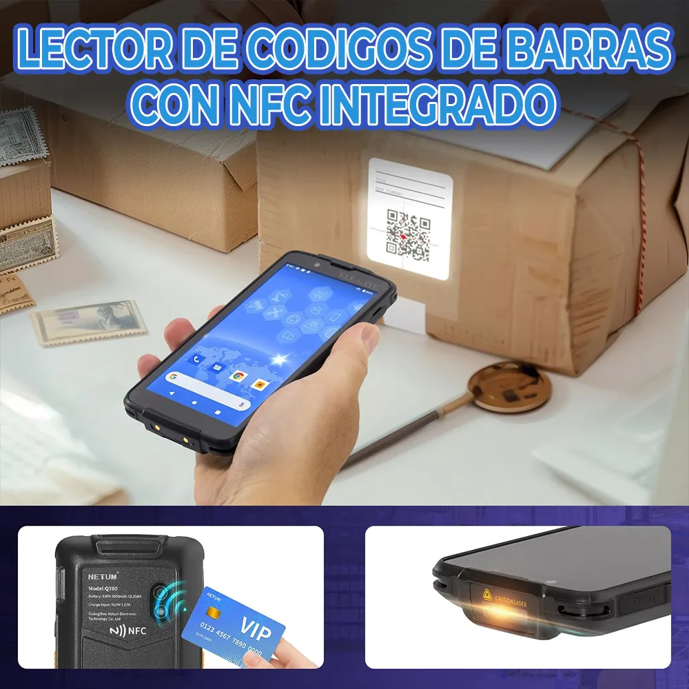 Escáner de Código de Barras 1D/2D Android PDA 4G WiFi Resistente al Agua y al Polvo con Lectora NFC. Gracias a su tecnología permite la lectura de codigos rotos, maltratados, mojados o deformados. Su lectora NFC permite usarla como terminal y poder realizar cobros o altas de pedidos masivos.