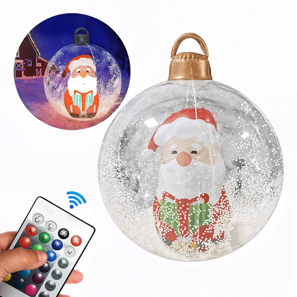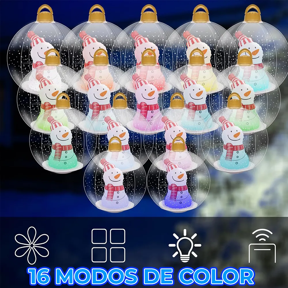 Esfera de Navidad Inflable Trasparente con Luz Led RGB y Efecto de Nieve. Ideal para exteriores con control remoto, gracias a sus 4 potentes leds ilumina cualquier espacio. Llena de espíritu navideño con sus colores RGB.