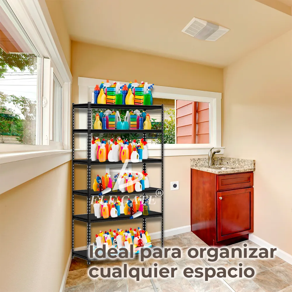 - Amplio espacio: Con 6 repisas de generosas dimensiones, este estante te proporciona un amplio espacio para almacenar una variedad de objetos, desde herramientas hasta suministros de hogar.