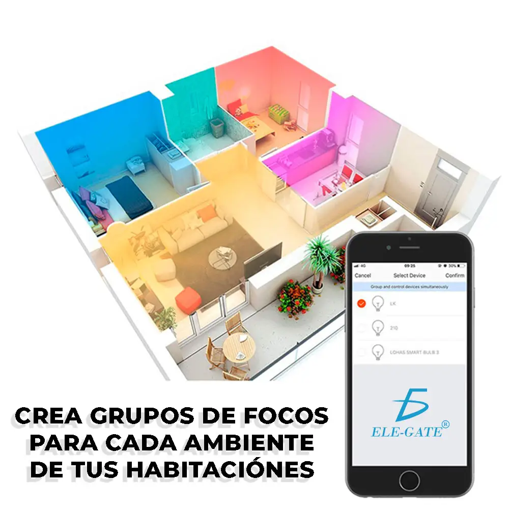 Es compatible para teléfonos IOS / Android. Crea grupos de focos para cada ambiente de tus habitaciones.