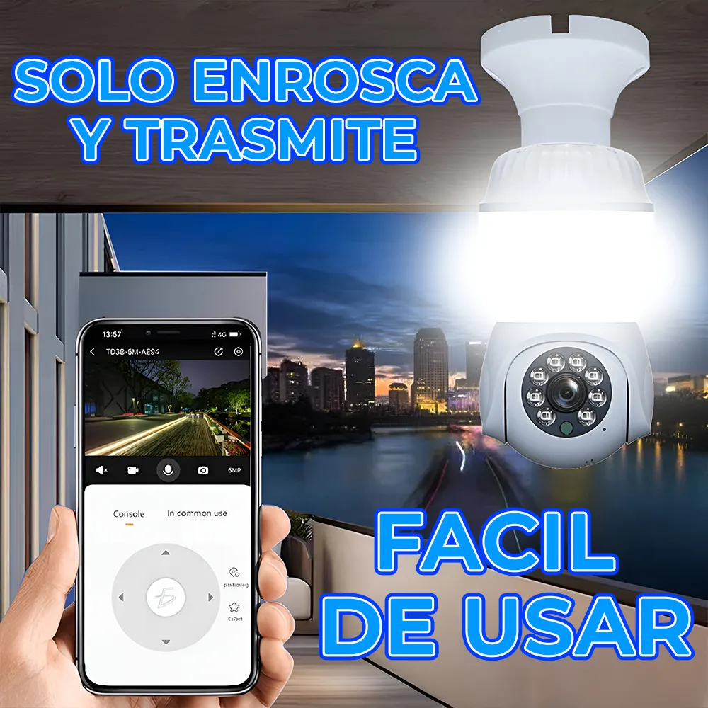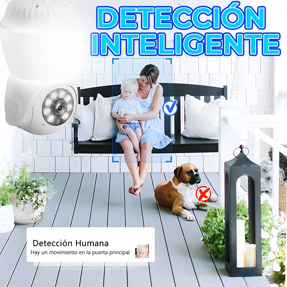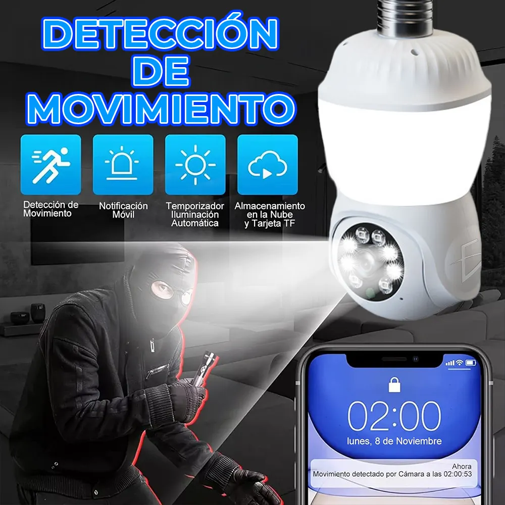 Foco LED Inteligente con Cámara Wifi 1080P HD 355° con detección IA, diseñado para ofrecer seguridad y comodidad en un solo dispositivo. Disfruta de visión nocturna a todo color, intercomunicador de voz bidireccional, grabación en bucle inteligente y monitoreo en tiempo real desde tu smartphone. Además, cuenta con Bluetooth, alarma integrada con parpadeo de luz disuasoria, y opciones de almacenamiento en tarjeta SD o en la nube para máxima seguridad. Ilumina, vigila y protege tu hogar de manera práctica y eficiente.