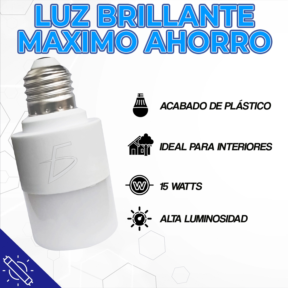 Su consumo de solo 15W, equivalente a 100W incandescente, te permite disfrutar de una iluminación potente y uniforme mientras reduces el gasto eléctrico. Además, su vida útil de 30 000 horas y su diseño multivoltaje lo convierten en una opción confiable y ecológica.