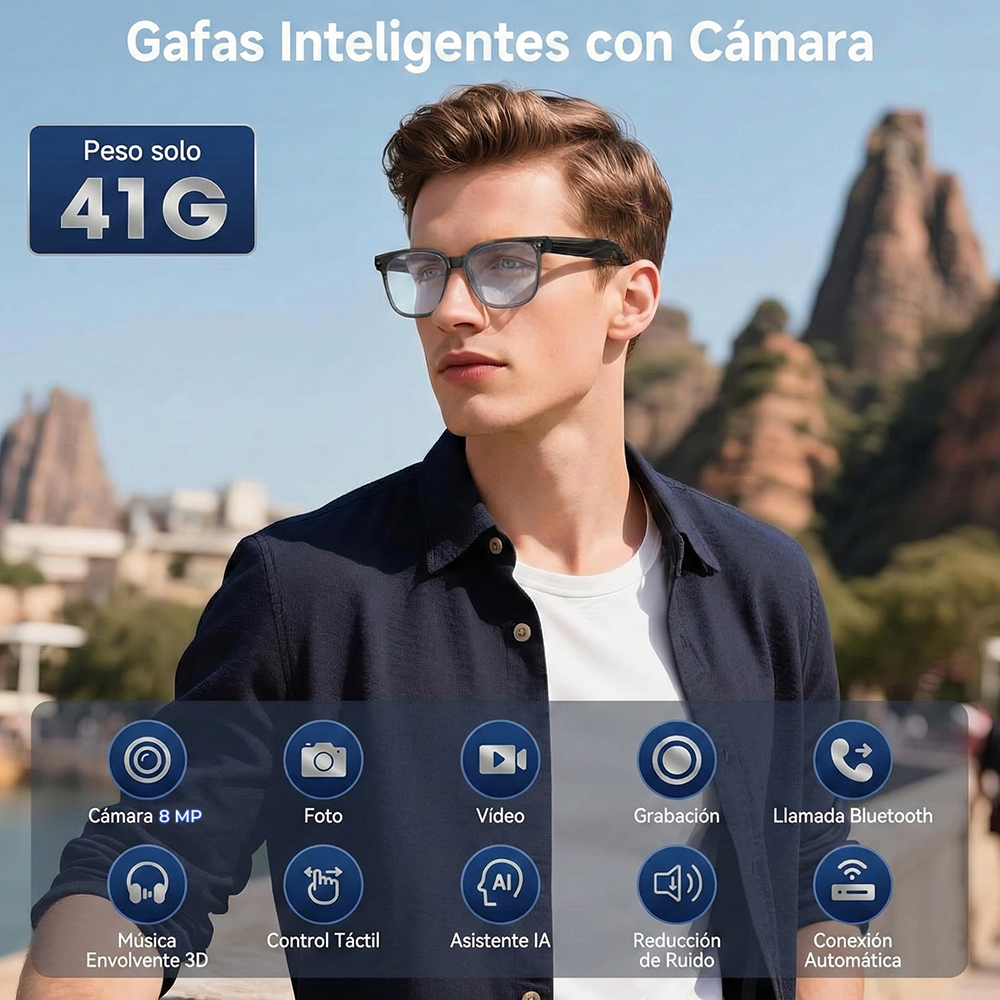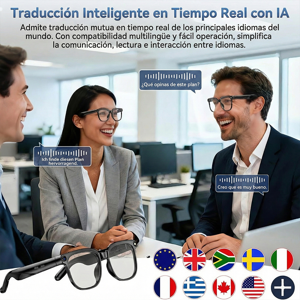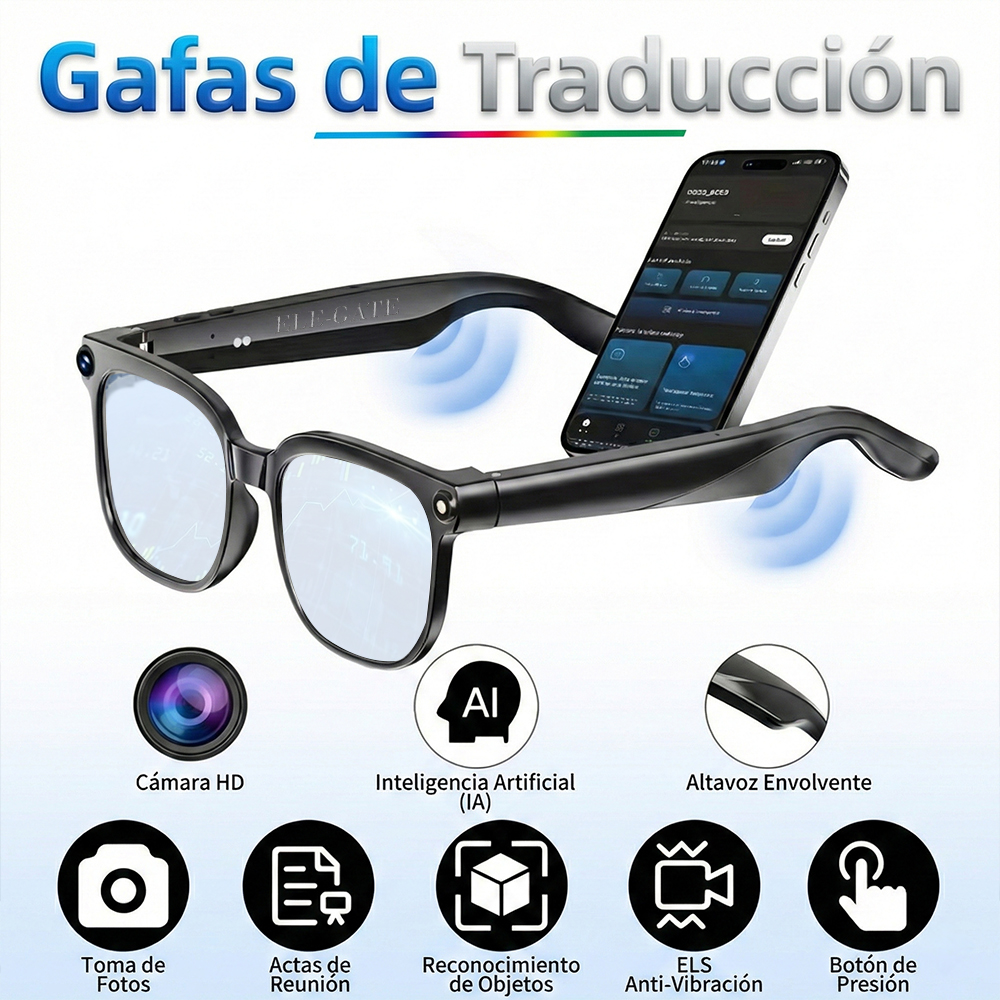 Descubre las Gafas Inteligentes con tecnología AI, equipadas con cámara HD de 8MP para capturar fotos y videos con gran nitidez, función de traducción en tiempo real multilenguaje ideal para viajes y negocios internacionales, llamadas Bluetooth manos libres y reproducción de música con diseño de audio abierto. Compatibles con Android e iOS, ofrecen asistente de voz inteligente, conectividad estable y diseño ergonómico ligero para uso diario, trabajo, estudio o actividades al aire libre. Perfectas para quienes buscan innovación, productividad y estilo en un solo dispositivo.