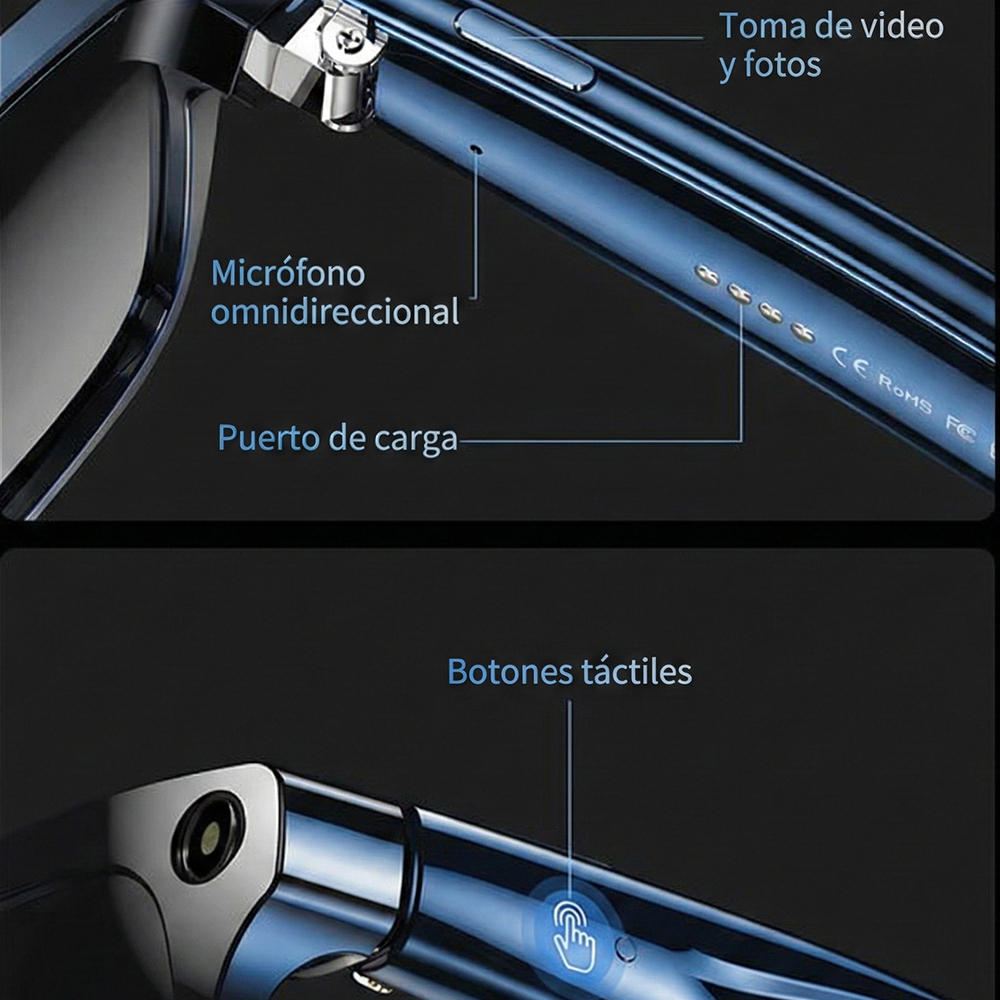 Funciones: Foto, video, traducción en tiempo real, llamadas Bluetooth, música, asistente de voz