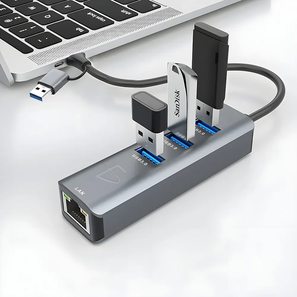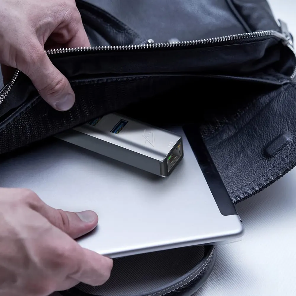 Su diseño compacto y resistente integra interfaces USB y RJ45 para que puedas conectar periféricos y acceder a una red por cable estable, todo desde un solo accesorio.