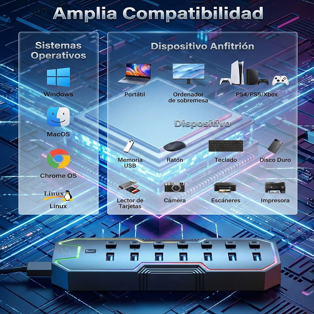 Potencia y estilo en un solo dispositivo. Este Hub USB 3.0 con iluminación LED RGB es la solución perfecta para ampliar los puertos de tu laptop o PC mientras agregas un toque moderno y gamer a tu espacio de trabajo.