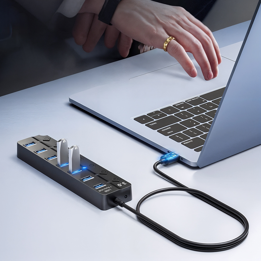 Optimiza tu espacio de trabajo y tus viajes con este Hub USB 3.0 de 7 puertos. Con velocidades de hasta 5 Gbps, conecta varios periféricos sin sacrificar rendimiento. Sus interruptores independientes con LED te permiten activar o desactivar cada puerto sin desconectar cables, mejorando la seguridad de extracción y el control de energía.
