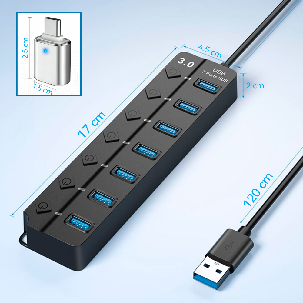 Optimiza tu espacio de trabajo y tus viajes con este Hub USB 3.0 de 7 puertos. Con velocidades de hasta 5 Gbps, conecta varios periféricos sin sacrificar rendimiento. Sus interruptores independientes con LED te permiten activar o desactivar cada puerto sin desconectar cables, mejorando la seguridad de extracción y el control de energía.