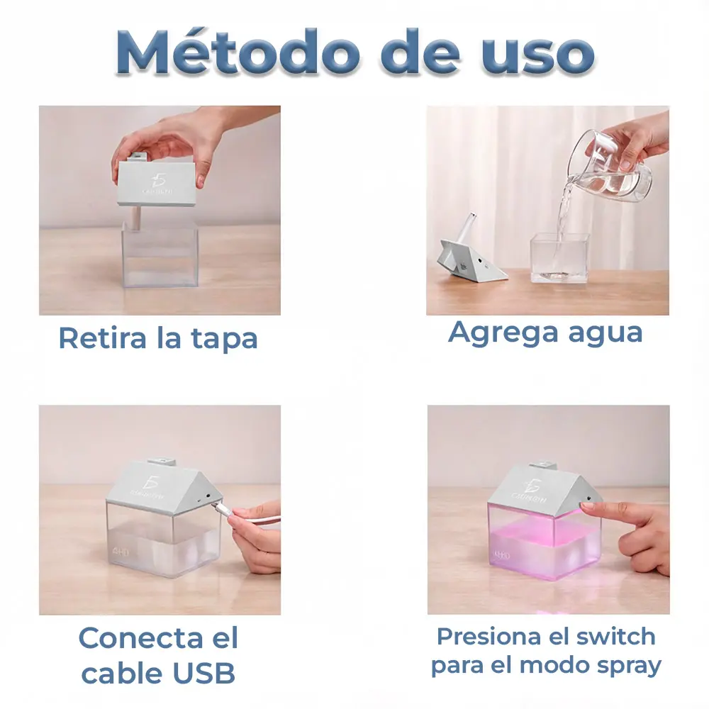 Humidificador Difusor Ultrasónico Aromaterapia en Forma de Casita – Compacto, elegante y funcional. Diseñado para brindar un ambiente fresco y saludable, este humidificador ultrasónico mantiene la humedad ideal en cualquier espacio, evitando la sequedad del aire. Su tecnología silenciosa permite disfrutar de una experiencia relajante sin interrupciones. Perfecto para el hogar, la oficina o cualquier lugar donde desees un toque de bienestar. Además, su diseño en forma de casita aporta un toque decorativo encantador. Compatible con aceites esenciales para una aromaterapia revitalizante. Fácil de usar, portátil, con apagado automático y luz LED ambiental.