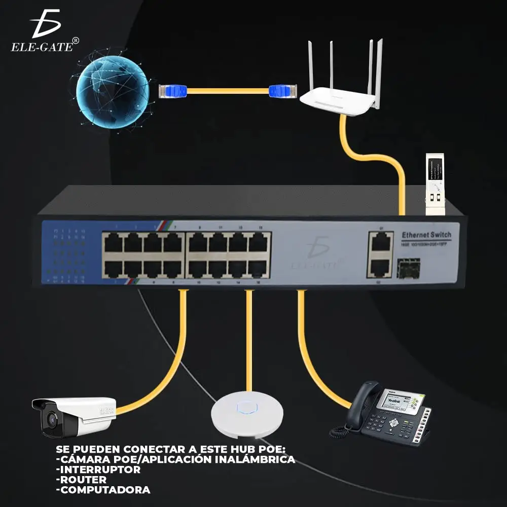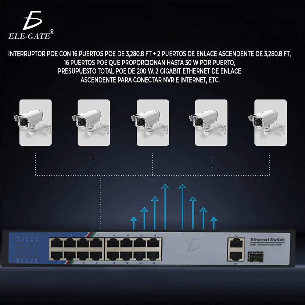 - Interruptor PoE+ de 16 puertos, presupuesto de energía interna máximo total de 250 W, hasta 30 W por puerto PoE, puerto de enlace ascendente adicional de 2 gigabit. Cumple con IEEE802.3af/at, detecta e identifica automáticamente dispositivos PD.
