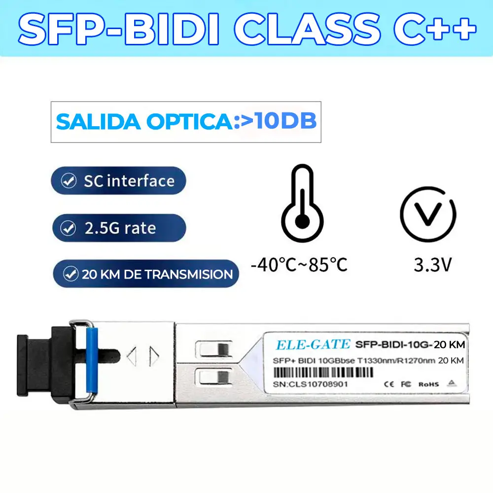 - Transceptor SFP+ Bidi, 10Gb/s SFP+ Bidi, conector LC único, longitud de onda: Up: TX1270nm/RX1330nm; Down: TX1330nm/RX1270nm, hasta 20km.