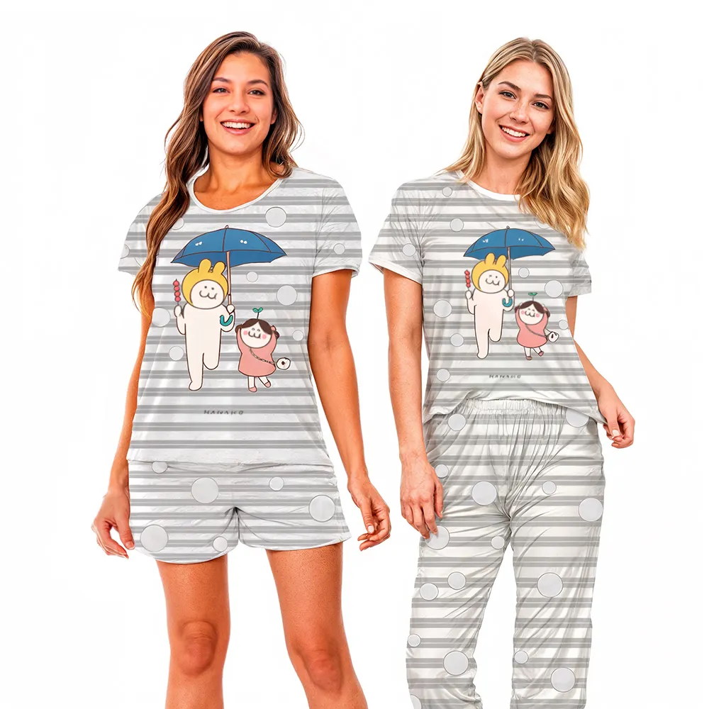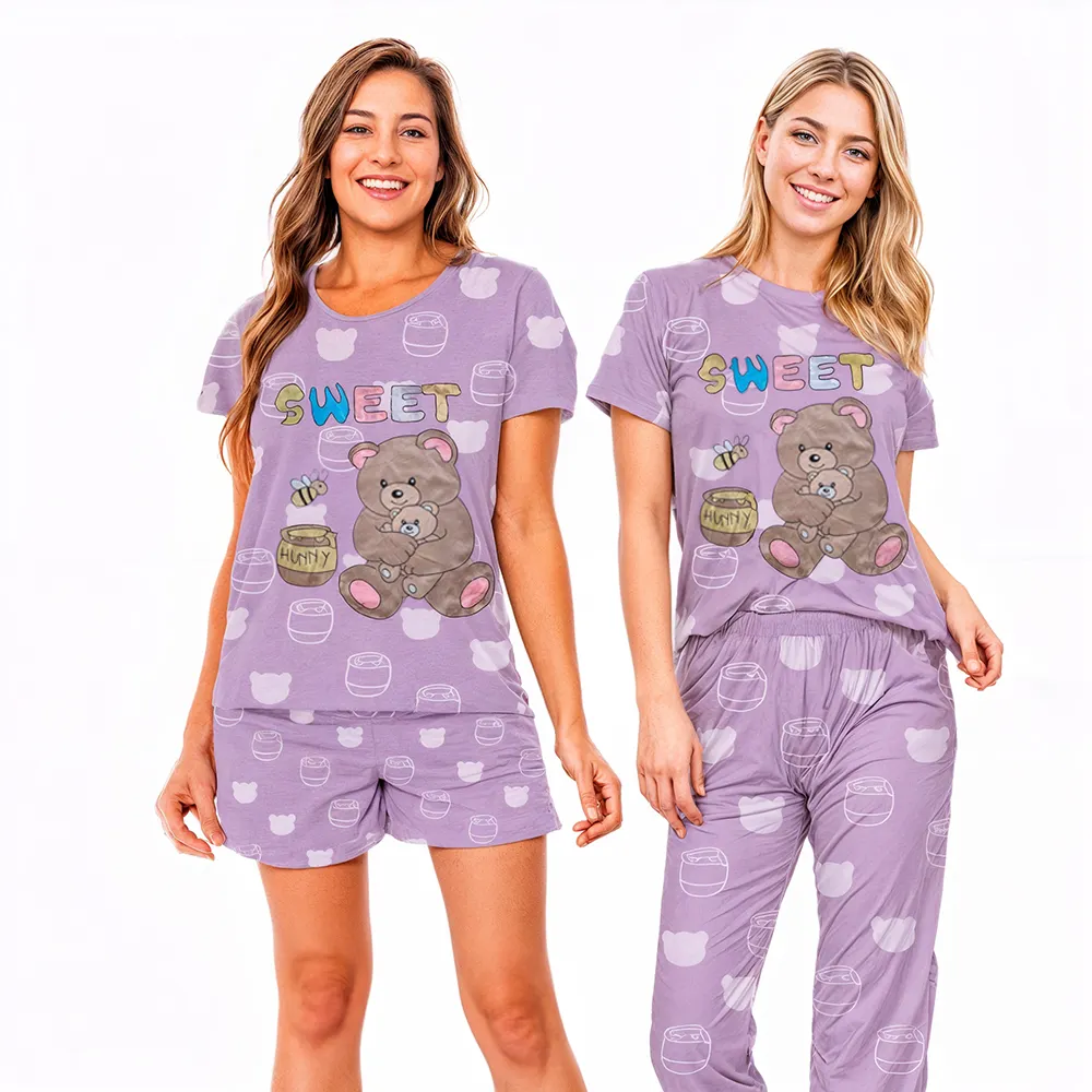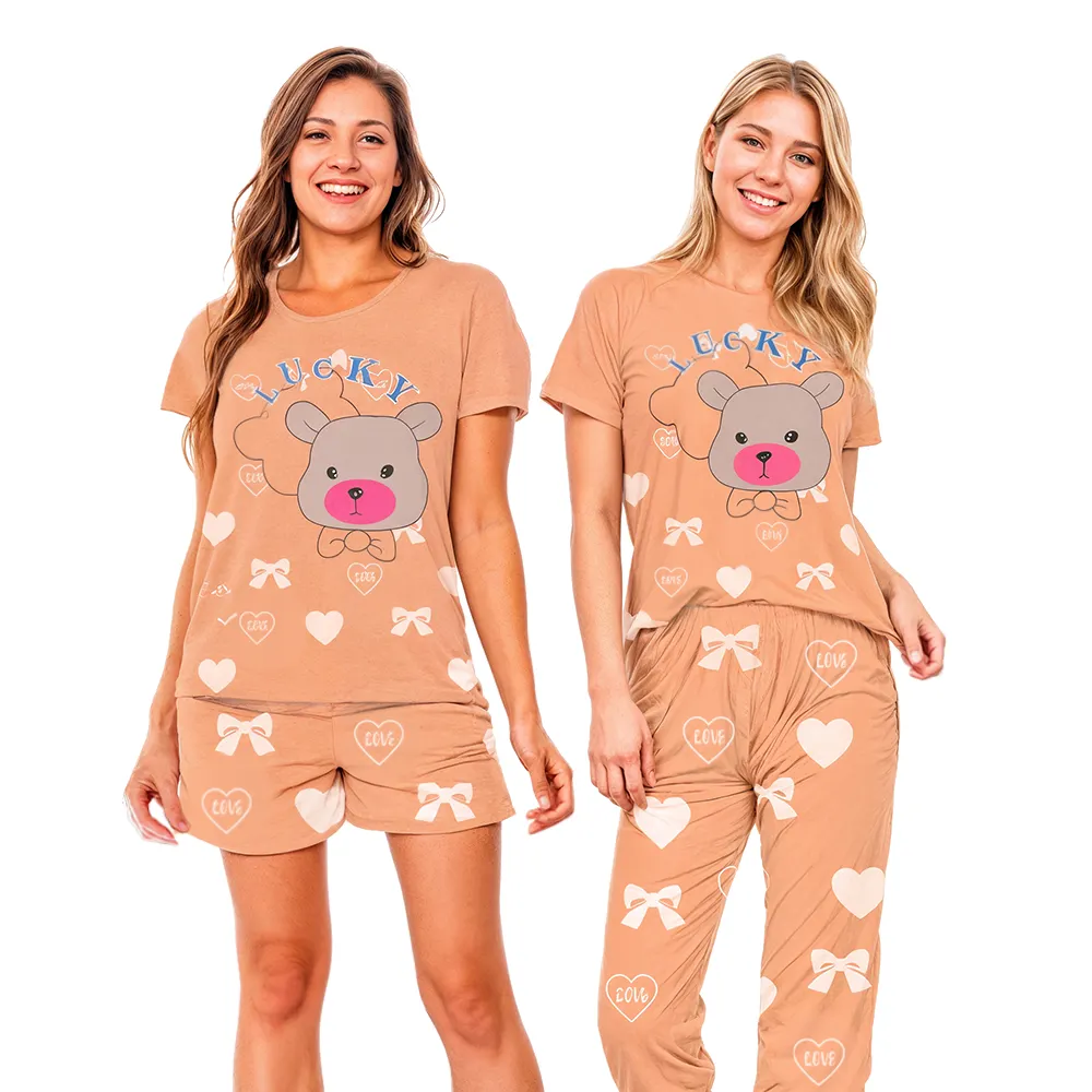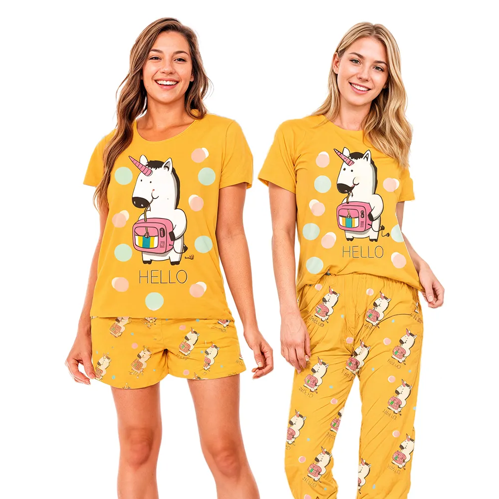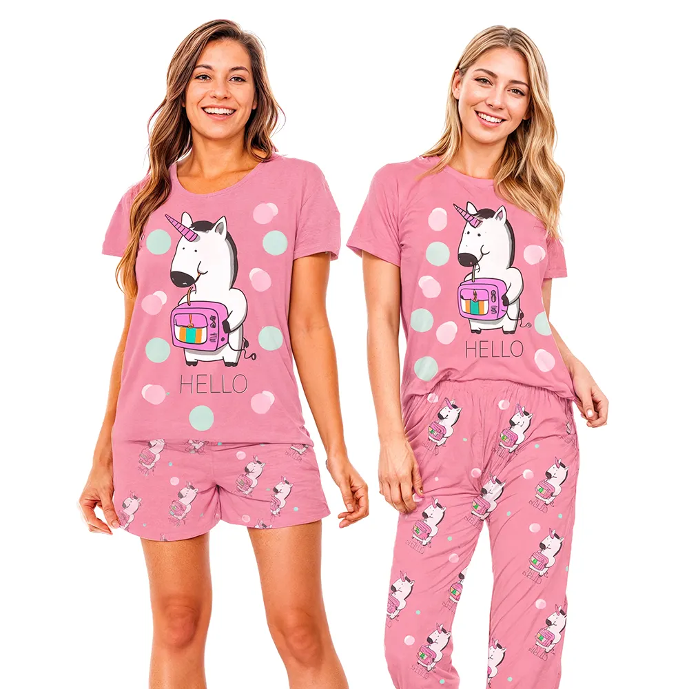 Renueva tu guardarropa de hogar con nuestro juego casual de ropa para mujeres. Este conjunto incluye una camiseta de manga larga y pantalones largos y cortos, disponibles en una variedad de estampados para satisfacer todos los gustos.