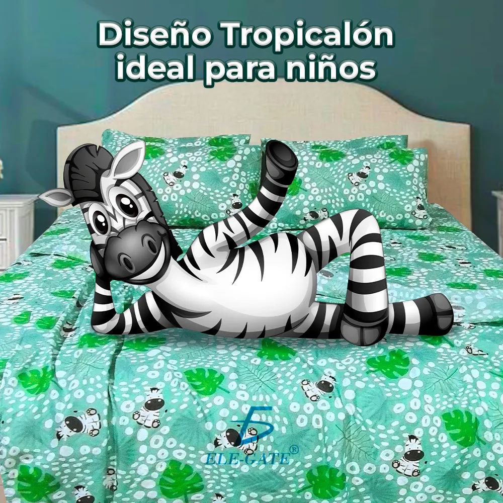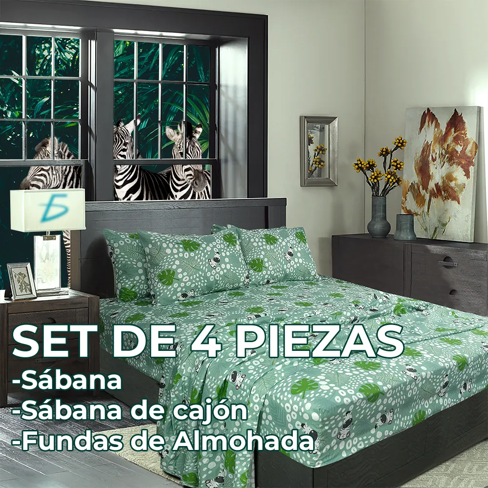 Juego de Sábanas Safari de 4 Piezas que Incluyen una Sábana Cajonera, una Sábana y Dos Fundas de Almohada. La sábana cajonera es totalmente elástica y se adapta a colchones de la medida seleccionada. Nuestras sabanas son 100% algodón fresco y ligero que no se hacen bolas.