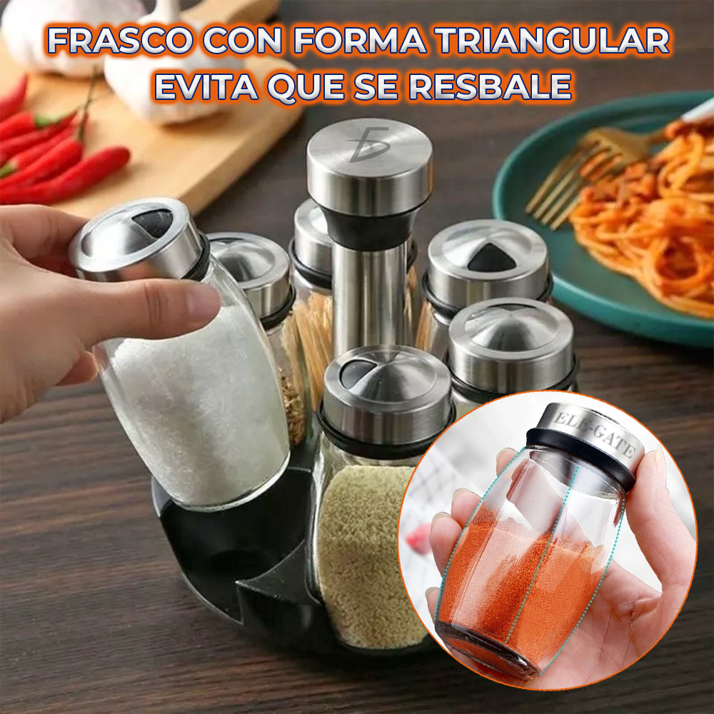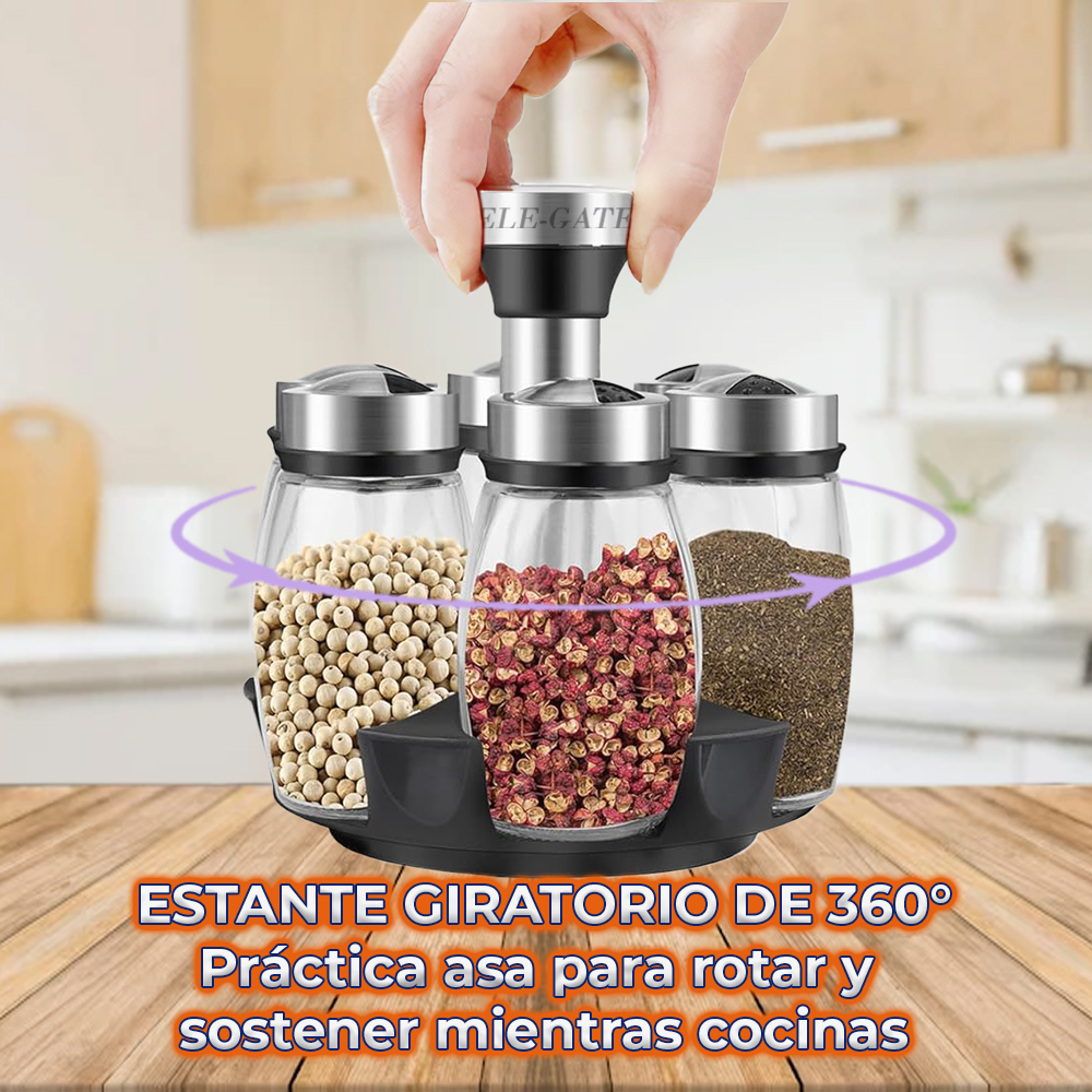 - Diseño Giratorio 360°: El soporte giratorio permite acceder fácilmente a los saleros y pimenteros con solo un giro, ideal para tener todas tus especias a mano.