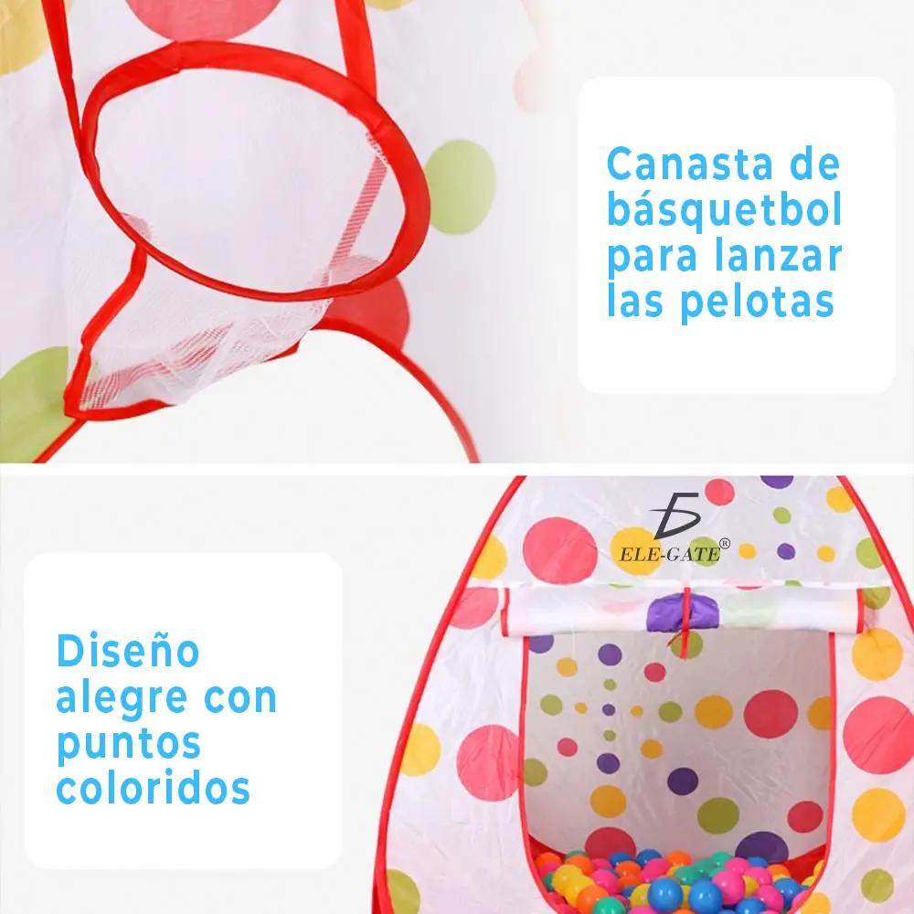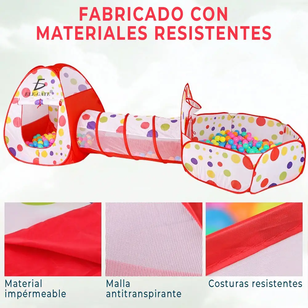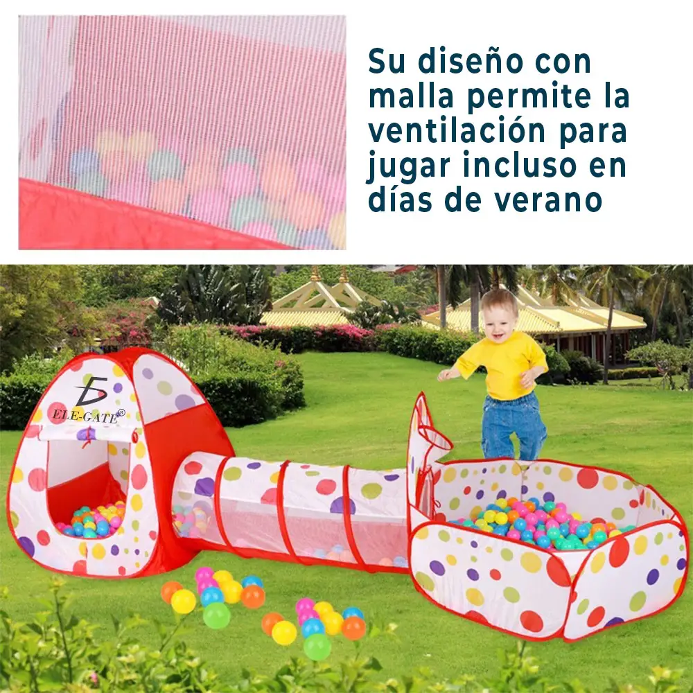 - Juegos 3 en 1: Alberca de Pelotas, Túnel y Casa de Campaña.