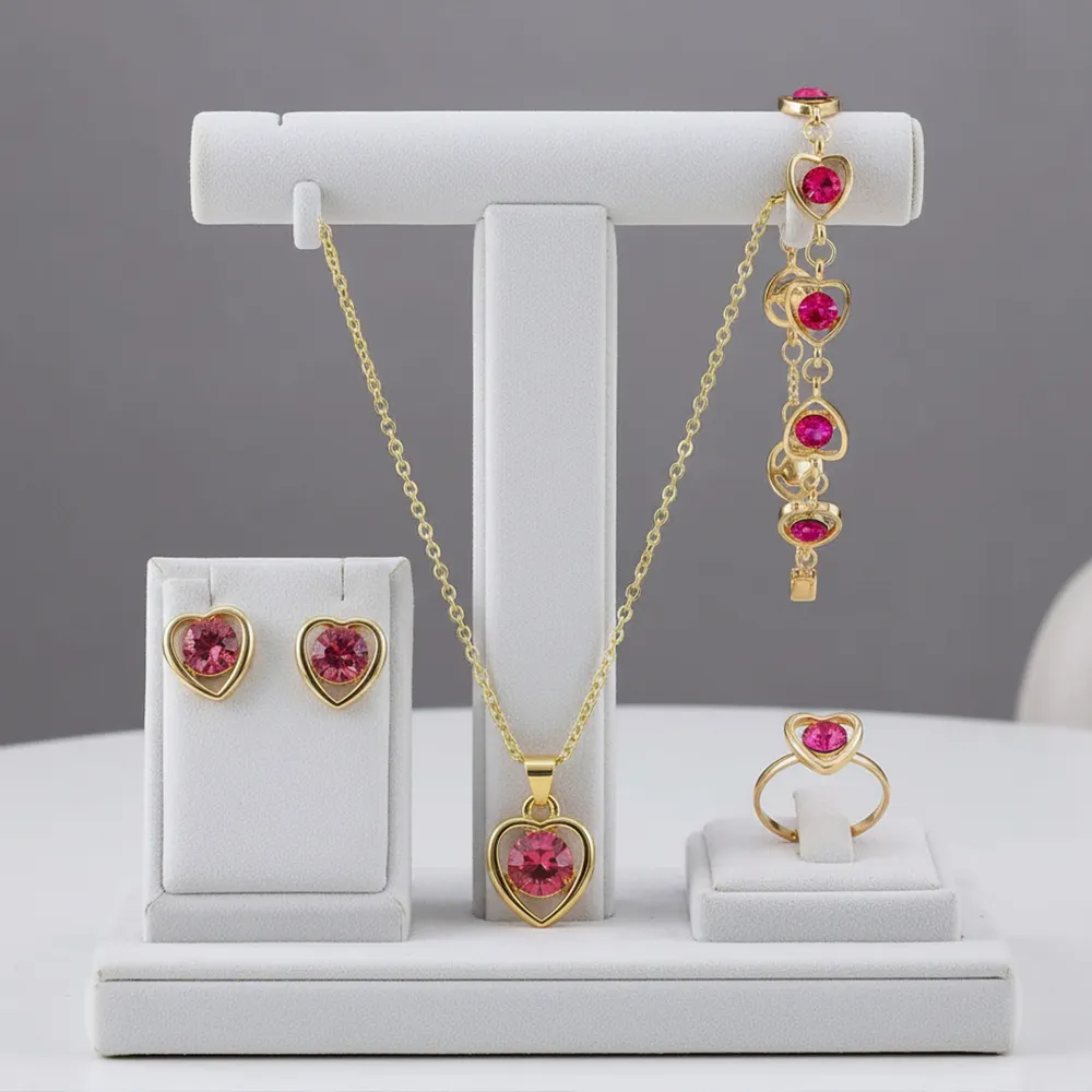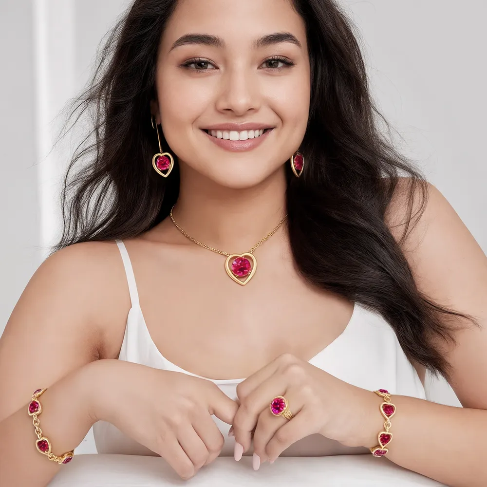 Todos en tono dorado con piedras de fantasía en forma de corazón color rojo, que añaden un toque romántico y elegante.
