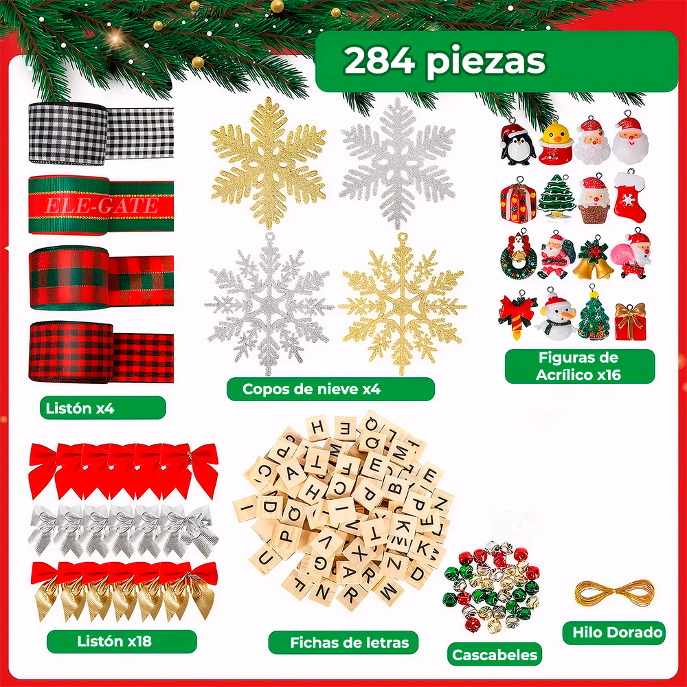 Dale un toque creativo, personal y familiar a tu Navidad con este completo kit de 284 piezas de adornos navideños, ideal para niños y adultos. Perfecto para crear decoraciones únicas, mensajes personalizados y momentos inolvidables en familia.