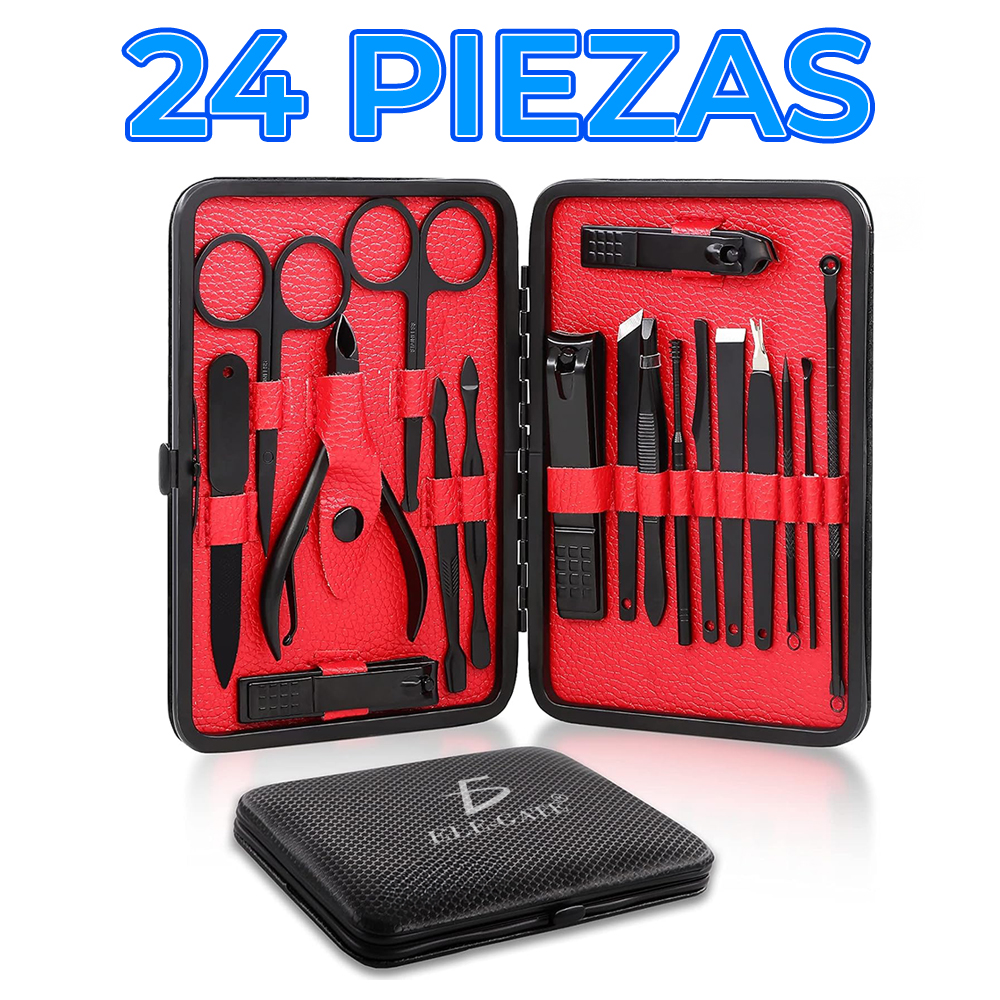 Set 24 en 1 todo-en-uno: incluye herramientas para manicure, pedicure y limpieza facial (extractores/aguja para acné, cortauñas, corta cutículas, pinza, limas, empujadores, tijeras y más) para un mantenimiento completo en casa o de viaje.
