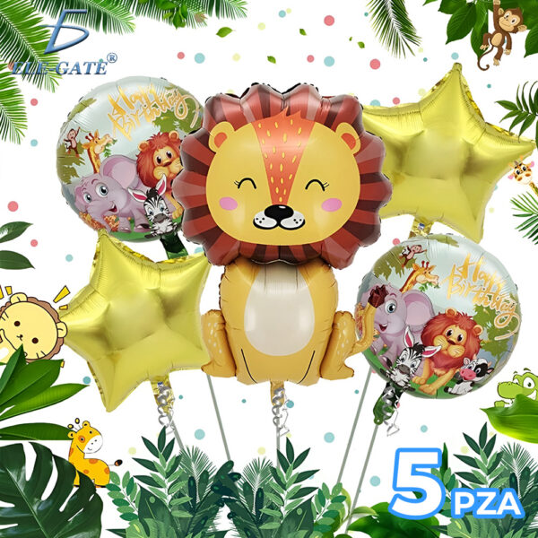 Kit de decoración de globos para fiesta infantil con temática de animales de la selva. Incluye globos coloridos y estampados duraderos, tira para armar cadenas y pegamento para fijarlos fácilmente. Ideal para crear una decoración profesional, divertida y llena de color en el cumpleaños de tu pequeño.