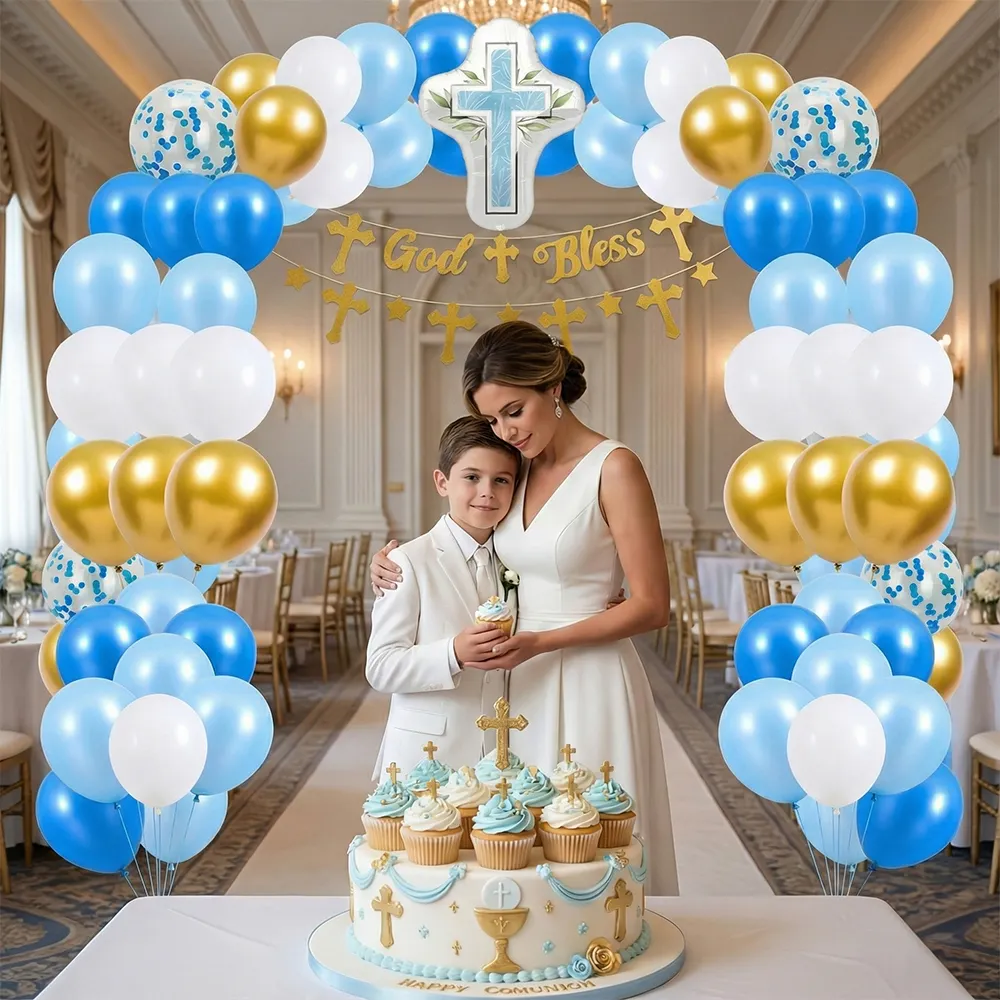 Celebra un momento especial con este elegante kit de decoración religiosa, ideal para Primera Comunión o Bautizo. Su diseño armoniza tonos azules, blancos y dorados, creando un ambiente solemne y festivo para ese día tan importante.