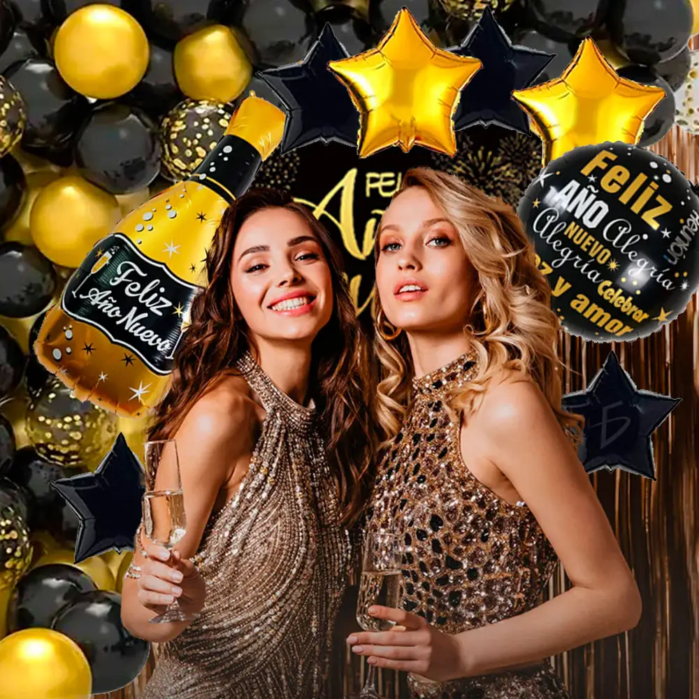 - Contenido: Globos de papel de aluminio de “Feliz Año Nuevo” + Globos de látex dorado con confeti