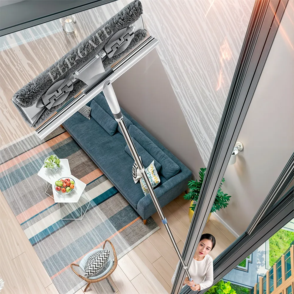 - Mecanismo de bloqueo giratorio: pulsa el botón para cambiar la posición de la escobilla de ventana, esto es ideal para ventanas y paneles no estándar. También es ideal para limpiar vidrio, ventanas, puertas de vidrio de ducha, pared, espejos, vidrio de vehículo, panel solar, limpieza de ventanas altas interiores y exteriores, escobilla de goma marina y barco