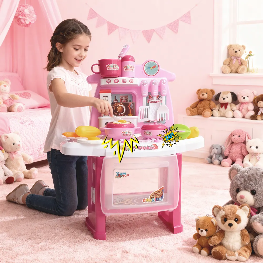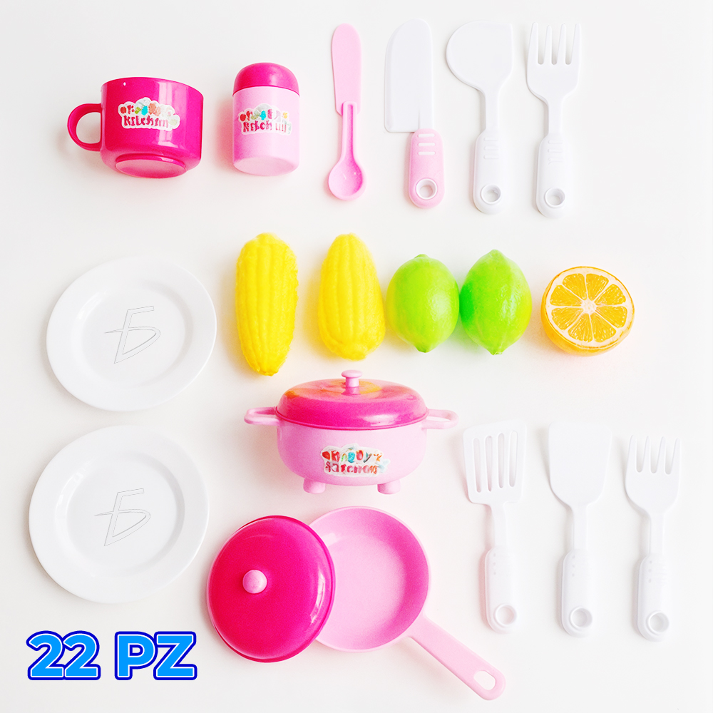 👩🍳 Juego de cocina completo: Incluye una estufa de juguete con sonido y luces, además de 22 accesorios como ollas, sartenes, utensilios y alimentos de juguete para crear horas de diversión.