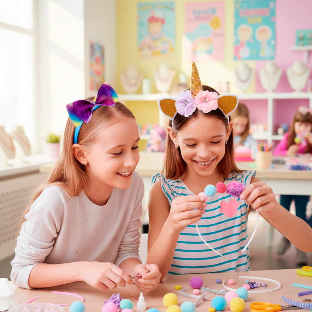🎀 Crea tu propio estilo: arma diademas personalizadas con accesorios coloridos, listones y adornos.