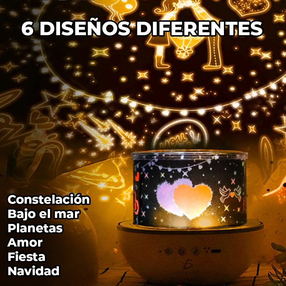 La luz del proyector viene con una cubierta blanca de plástico extraíble, puede hacer que funcione como una luz de noche, o usarla como luz de un proyector quitando la cubierta, tendrá un increíble espectáculo de proyección. Contiene seis temas diferentes: Constelación, Amor, Navidad, Fiesta, Planetas y Bajo el mar.