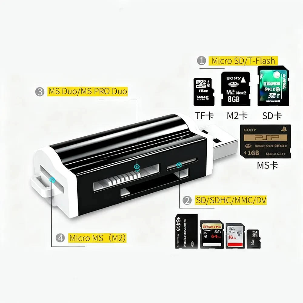 Este lector de tarjetas multifunción combina un diseño compacto en forma de encendedor con una estructura de aluminio resistente, convirtiéndolo en una herramienta portátil y elegante para transferir y gestionar archivos desde múltiples tipos de tarjetas de memoria. Ideal para cámaras, teléfonos antiguos, consolas y dispositivos que utilicen tarjetas SD, TF o M2.