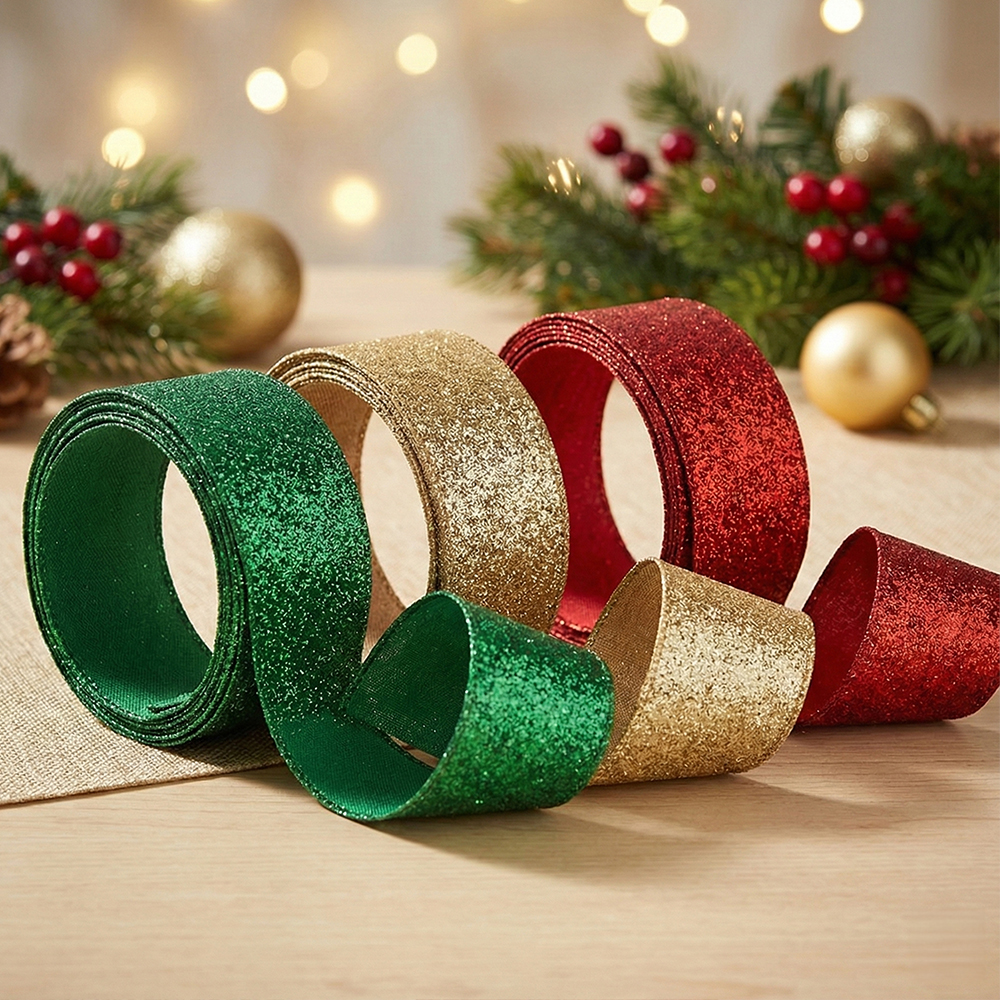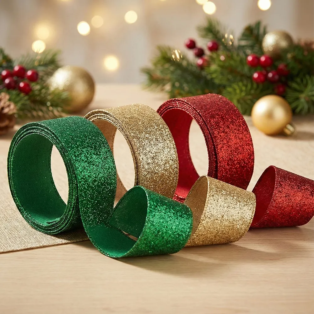 Llena de glamour y brillo tus regalos y decoraciones con este listón de tela con terminado de brillantina en elegantes colores rojo, verde y dorado, ideales para la temporada navideña. Su diseño llamativo hace que cualquier detalle resalte y se convierta en el centro de atención.