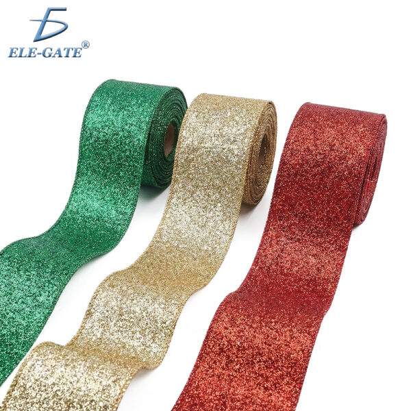 Llena de glamour y brillo tus regalos y decoraciones con este listón de tela con terminado de brillantina en elegantes colores rojo, verde y dorado, ideales para la temporada navideña. Su diseño llamativo hace que cualquier detalle resalte y se convierta en el centro de atención.