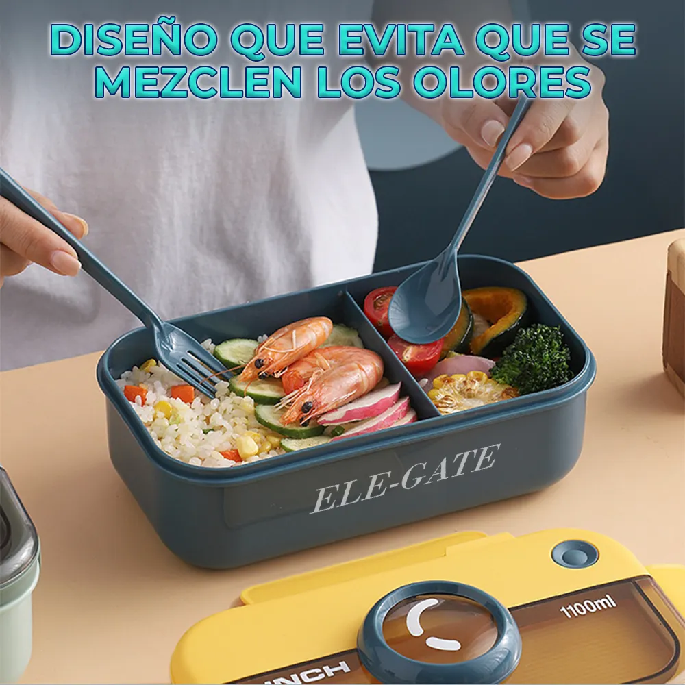 Con una capacidad de 1100 ml, esta Lunch Box tiene espacio suficiente para llevar tus comidas favoritas. Además, cuenta con cubiertos integrados para mayor comodidad, asegurando que tengas todo lo que necesitas para disfrutar de tu almuerzo en cualquier lugar.