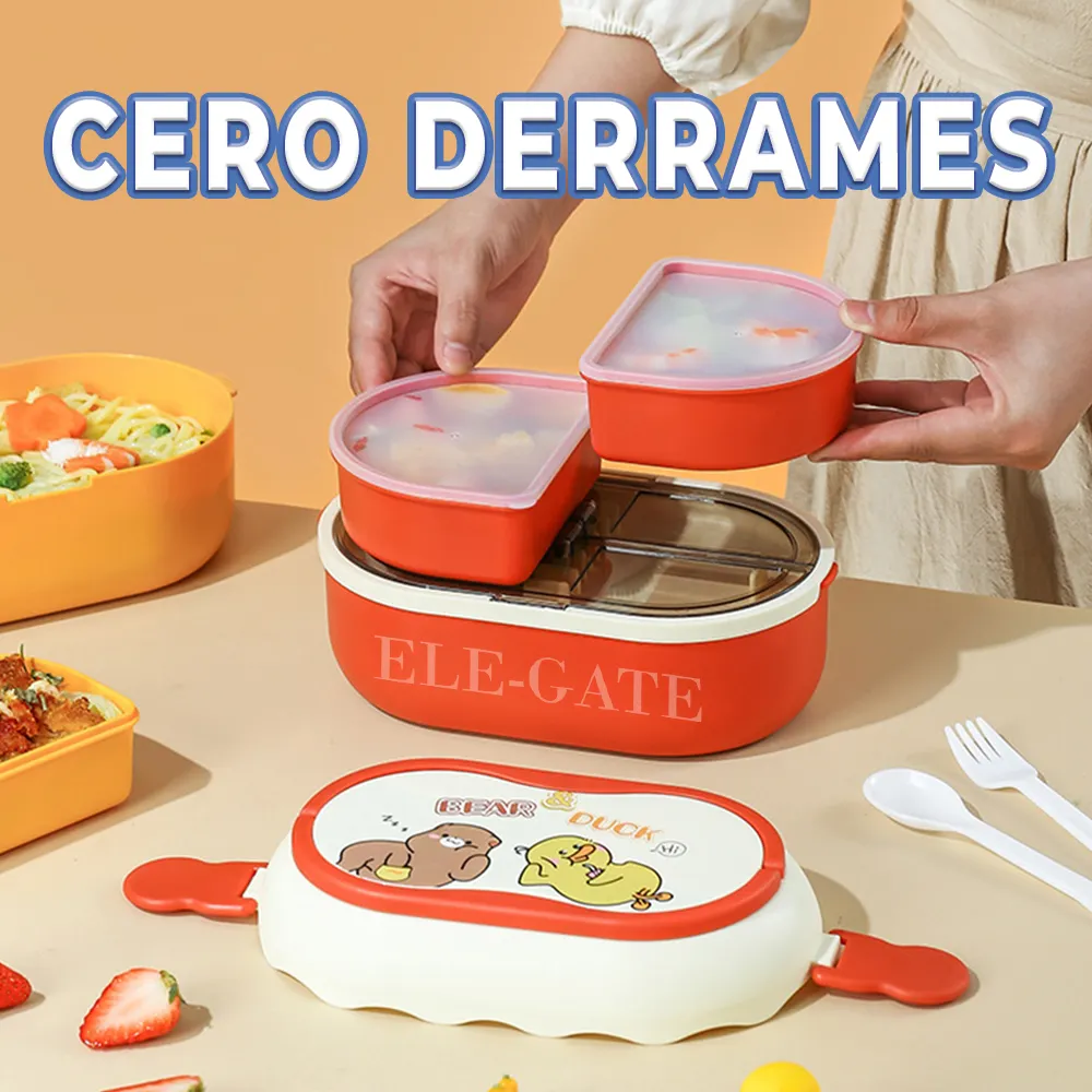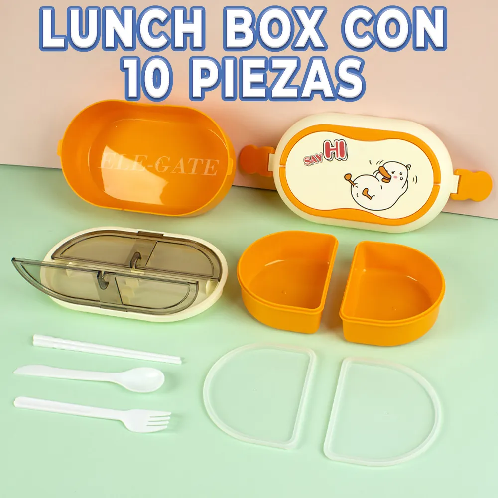 Lunch Box estilo Kawaii de 10 piezas con tres compartimientos con palillos chinos, tenedor y cuchara. Ideal para comer cualquier tipo de Lunch.