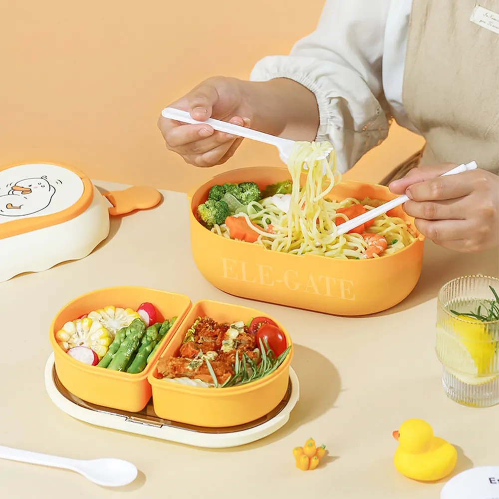 Esta Lunch Box viene con un diseño estilo Kawaii que agrega un toque de alegría y diversión a tus comidas. Además, incluye palillos chinos, tenedor y cuchara, lo que la hace conveniente para comer una variedad de platos asiáticos y occidentales.