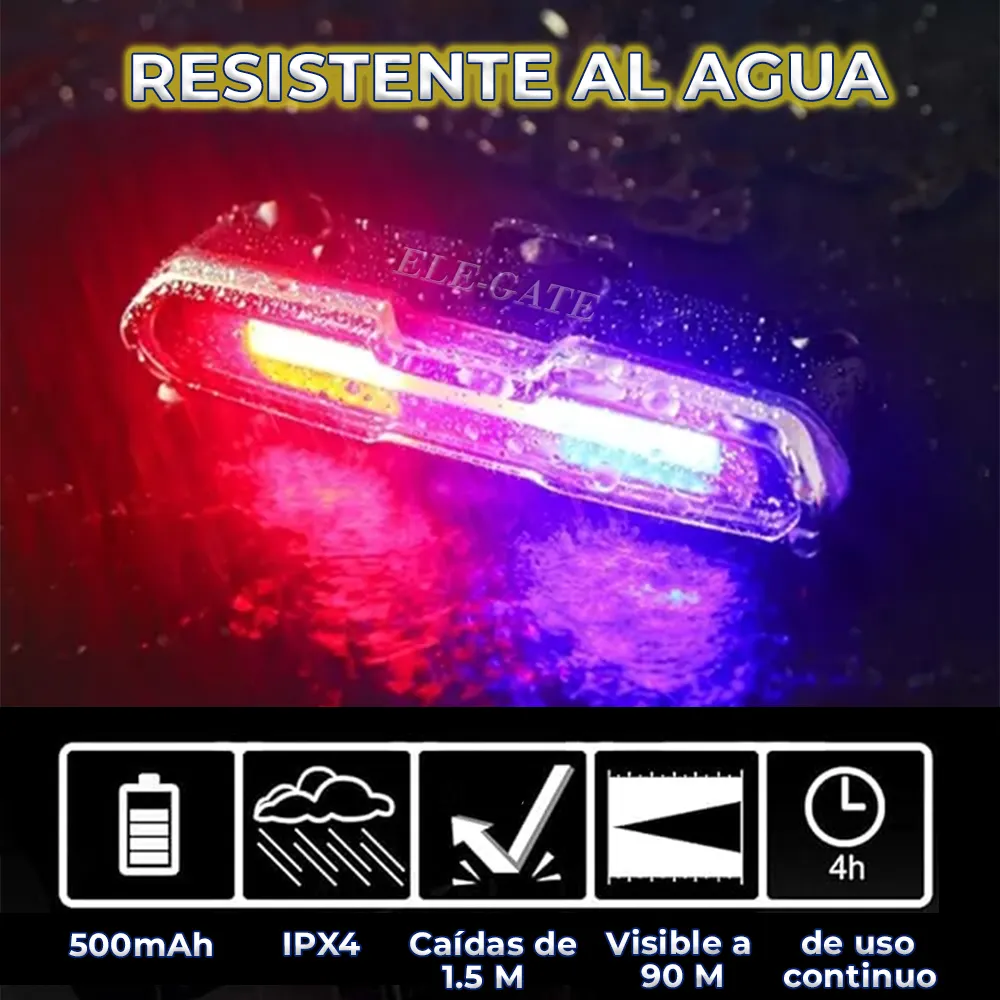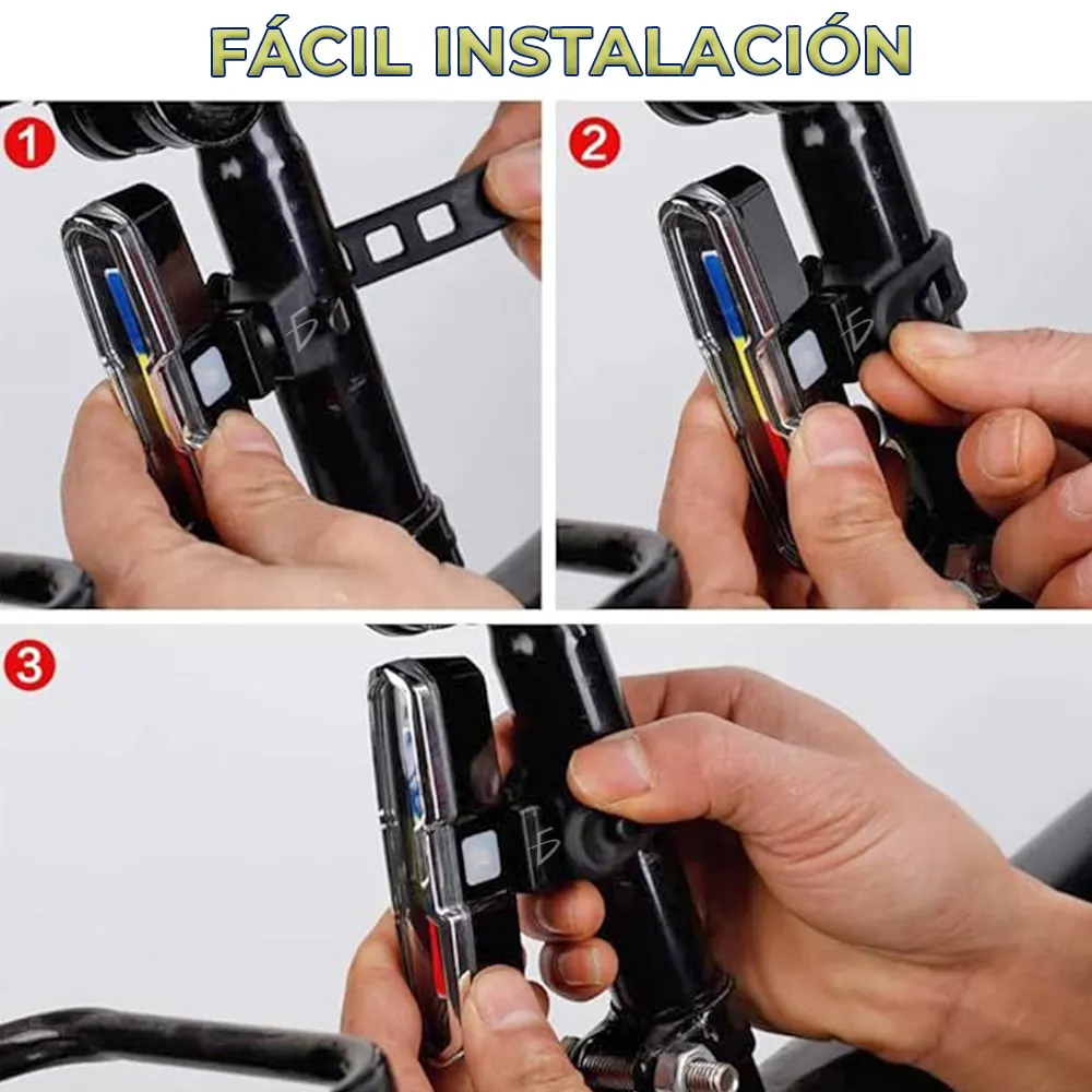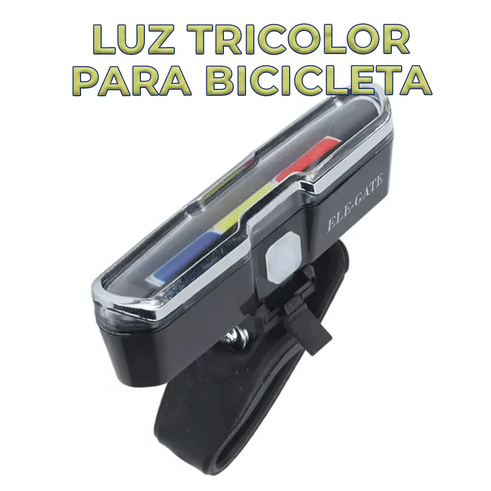 Luz Tricolor para Bicicleta con 4 horas de uso continuo, a prueba de agua y facil de instalar con tres modos de luz, fija, de emergencia y de latencia.