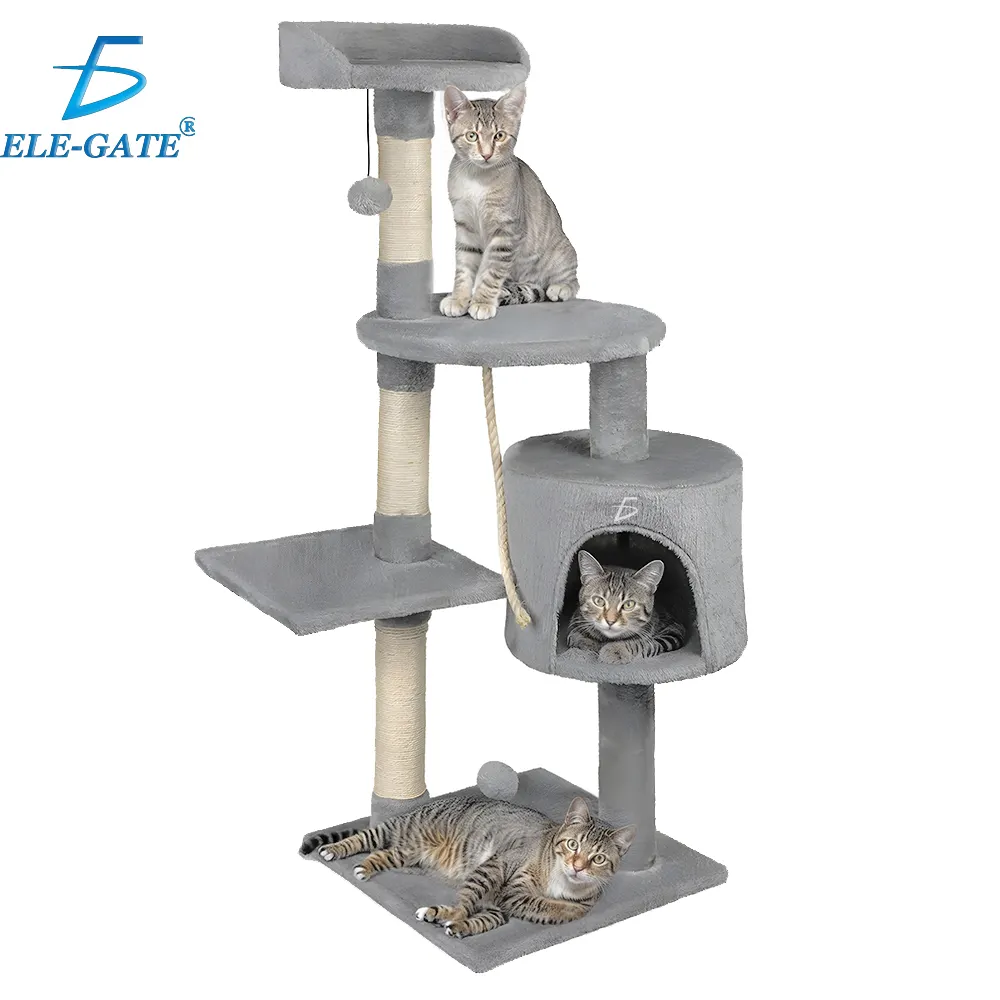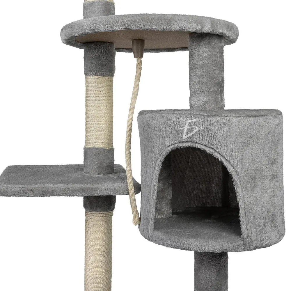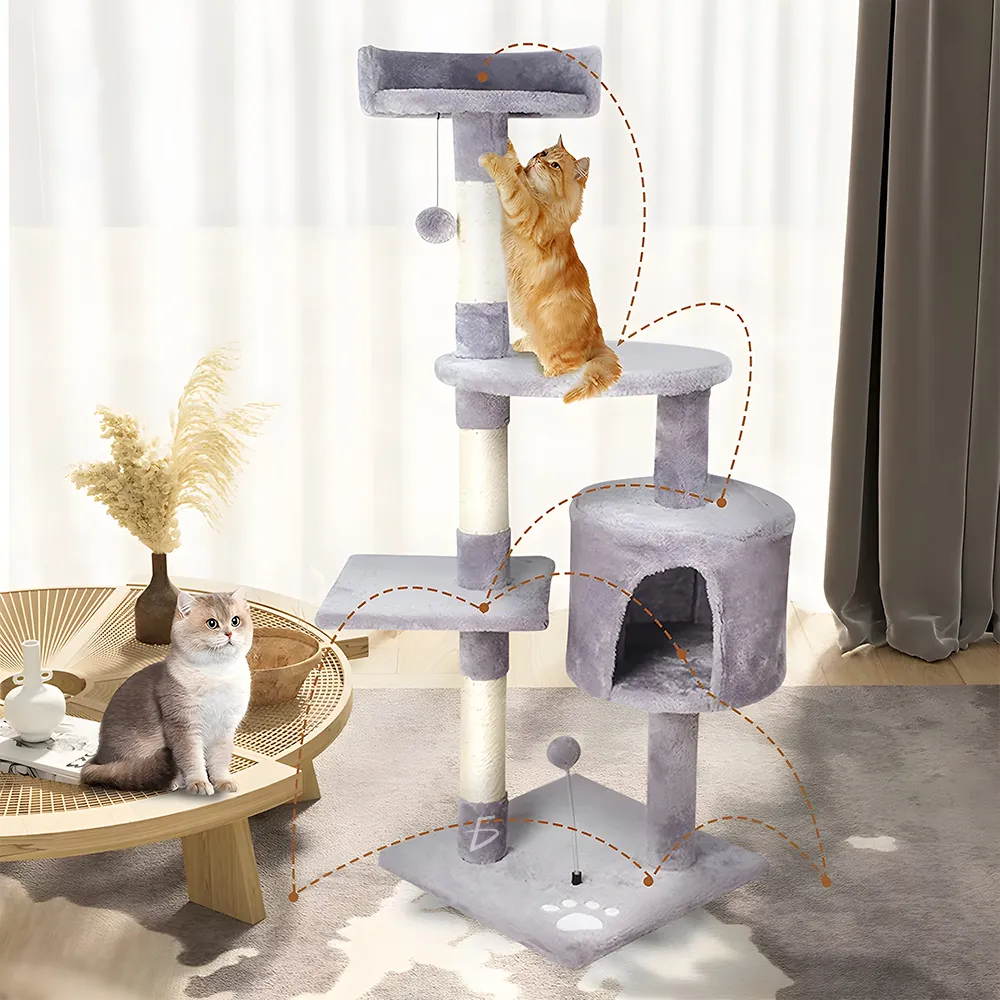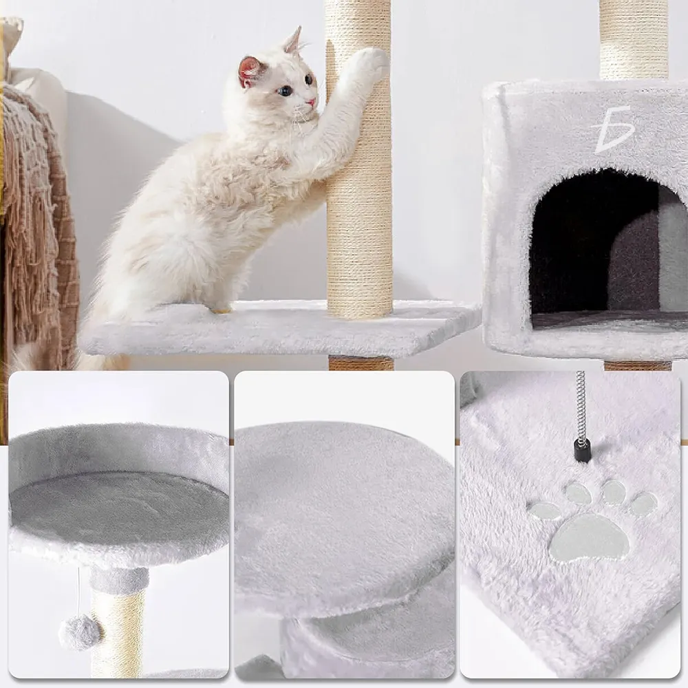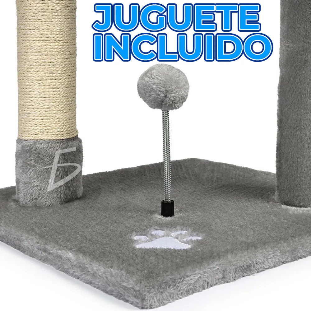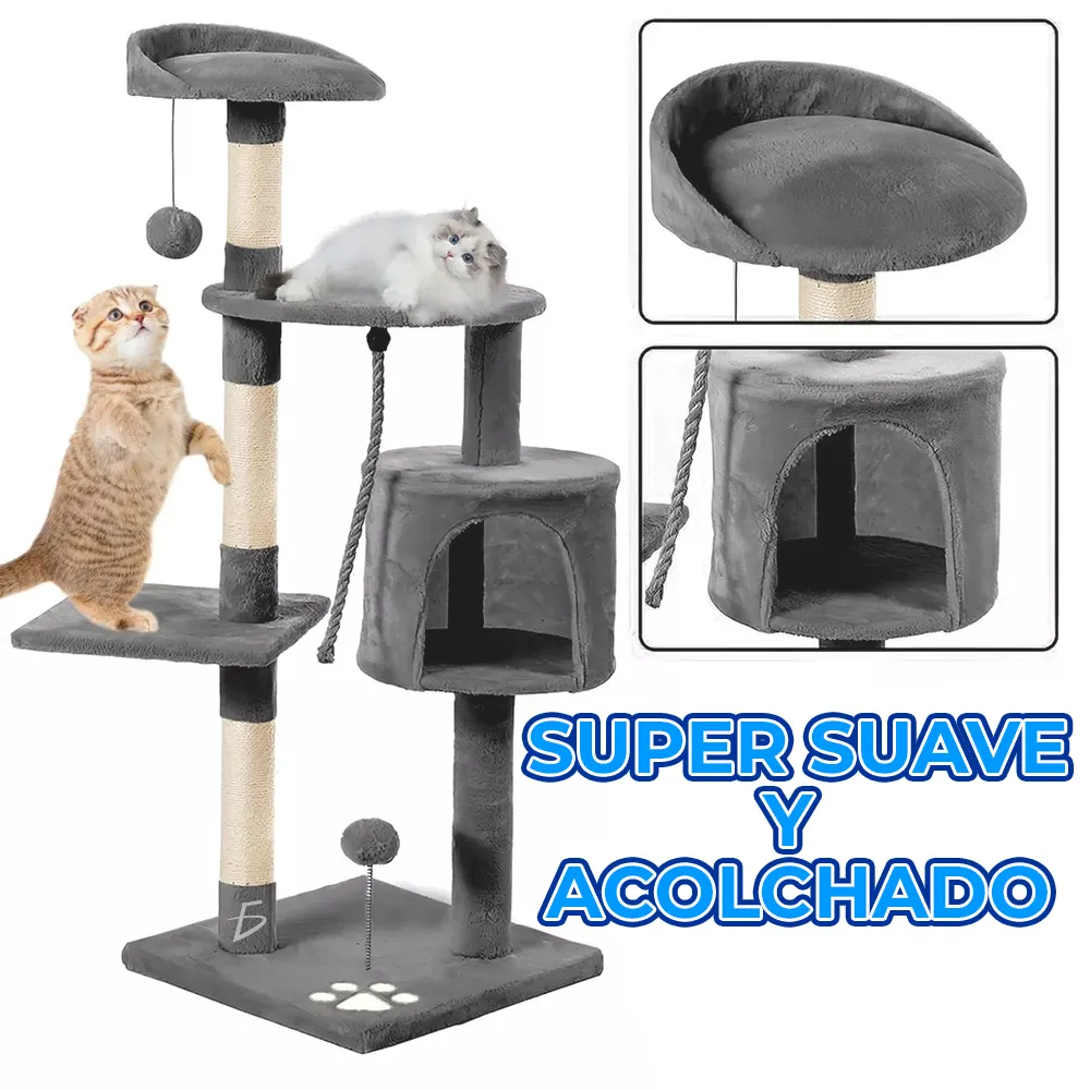 Torre Rascador Afelpada y Acolchada con 4 Niveles 3 Juguetes y Una Casita. Ideal para que tu gatito se sienta consentido y seguro gracias a su altura de 1.1o metros. Lo que lo hace ideal para cualquier etapa de tu gatito.