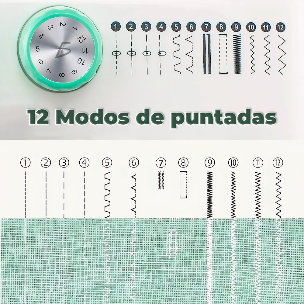 Cuenta con 12 tipos de puntadas diferentes, seleccionables fácilmente mediante un botón giratorio.
