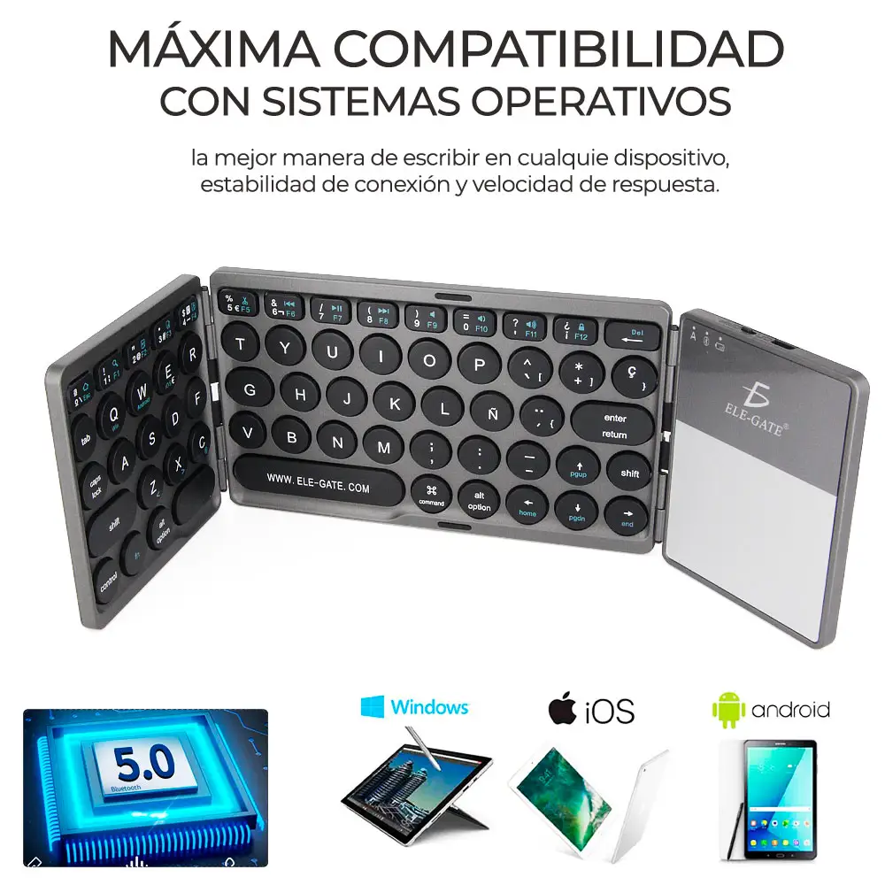 El Teclado Inalámbrico Bluetooth Plegable es Compatible con sistemas operativos: iOS / Android / Windows, este teclado plegable fue diseñado para trabajar con el iPad, iPhone, Android, Windows tabletas, PC y Windows Phone.