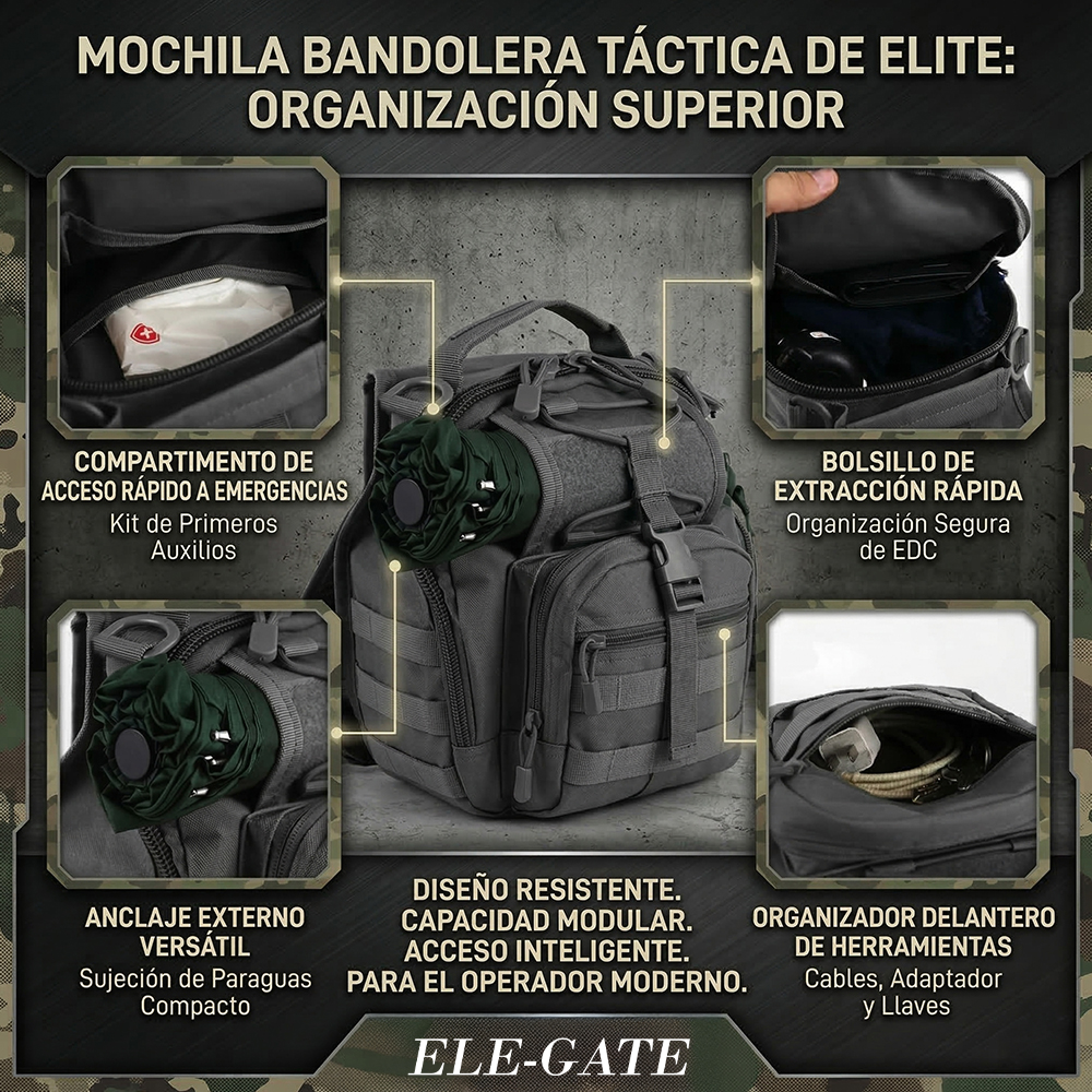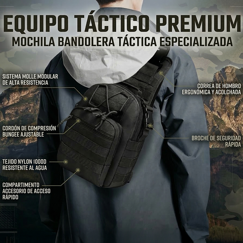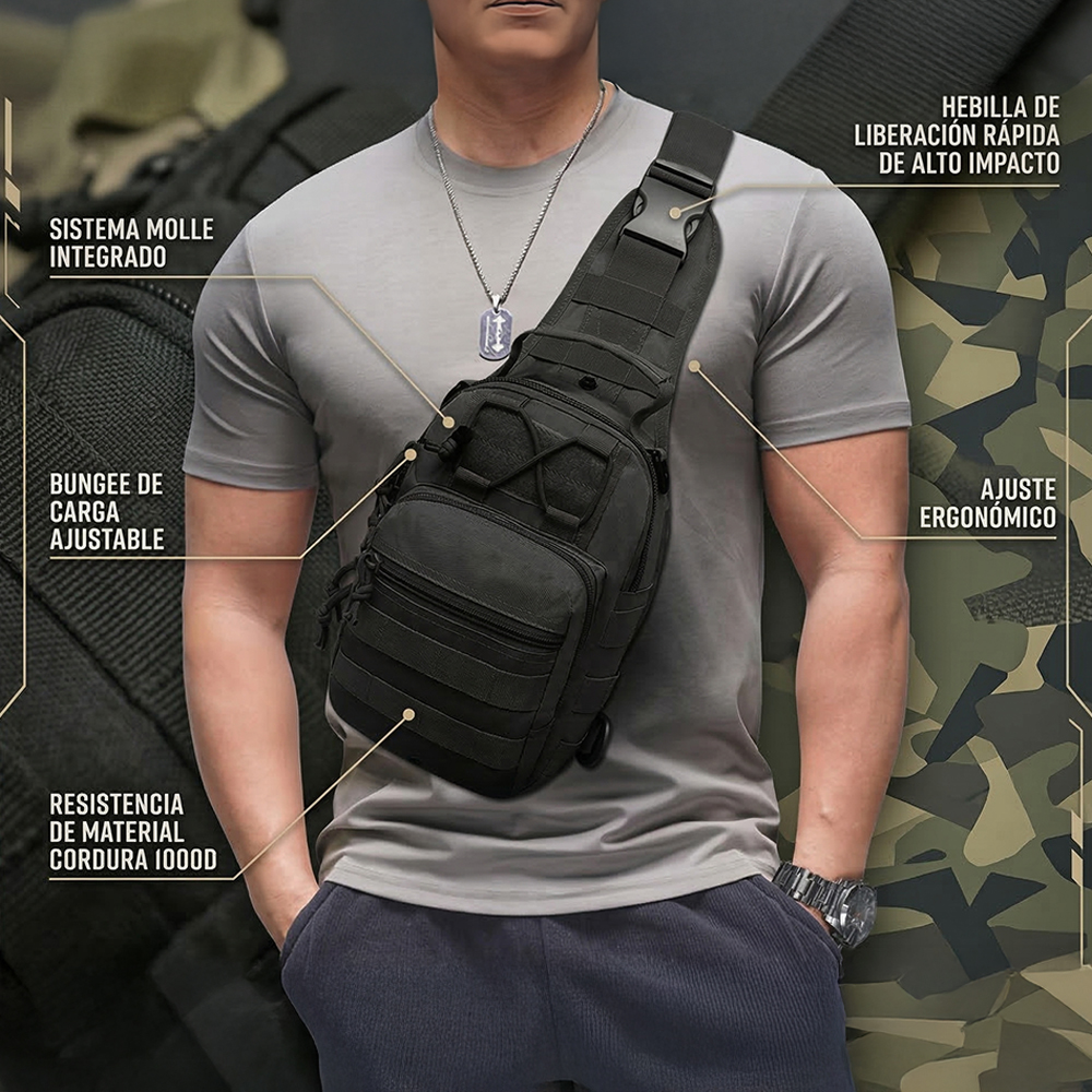 Esta mochila táctica tipo bandolera combina estilo militar con un diseño compacto y moderno, ideal para quienes buscan funcionalidad y comodidad en sus actividades diarias o al aire libre.
