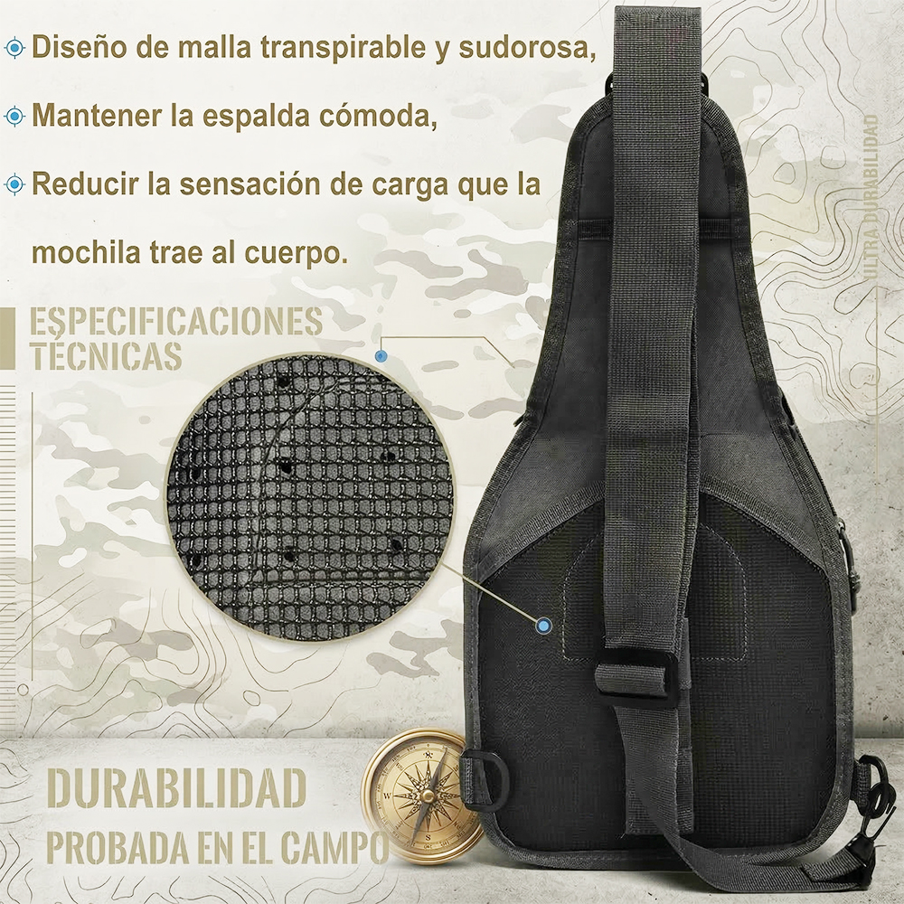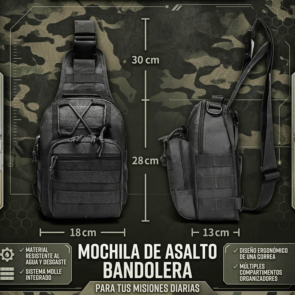 Esta mochila táctica tipo bandolera combina estilo militar con un diseño compacto y moderno, ideal para quienes buscan funcionalidad y comodidad en sus actividades diarias o al aire libre.
