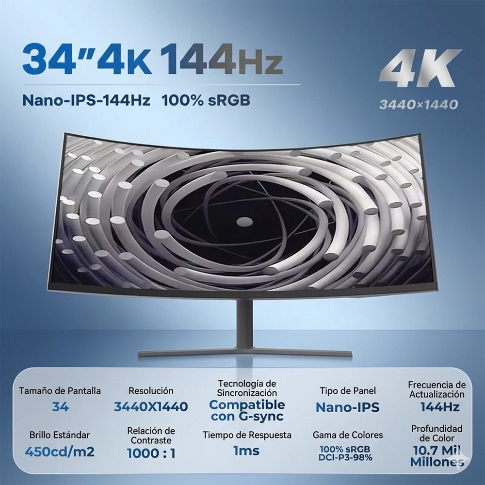 Eleva tu experiencia de juego al siguiente nivel con el Monitor Curvo LED de 34 pulgadas 4K. Disfruta de una visión panorámica detallada y una jugabilidad suave, perfecta para los gamers que buscan calidad y estilo. ¡Haz que cada juego sea una experiencia épica con este monitor de alto rendimiento!