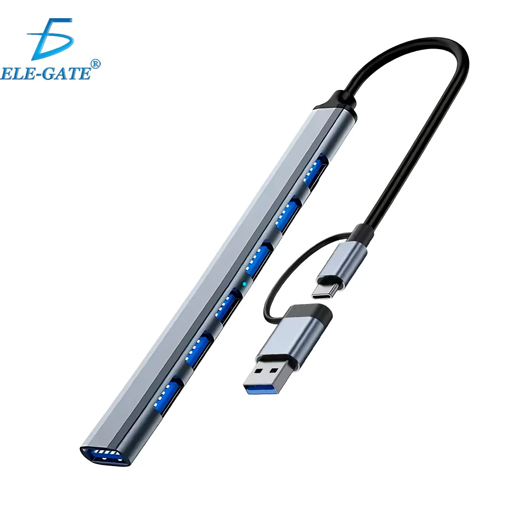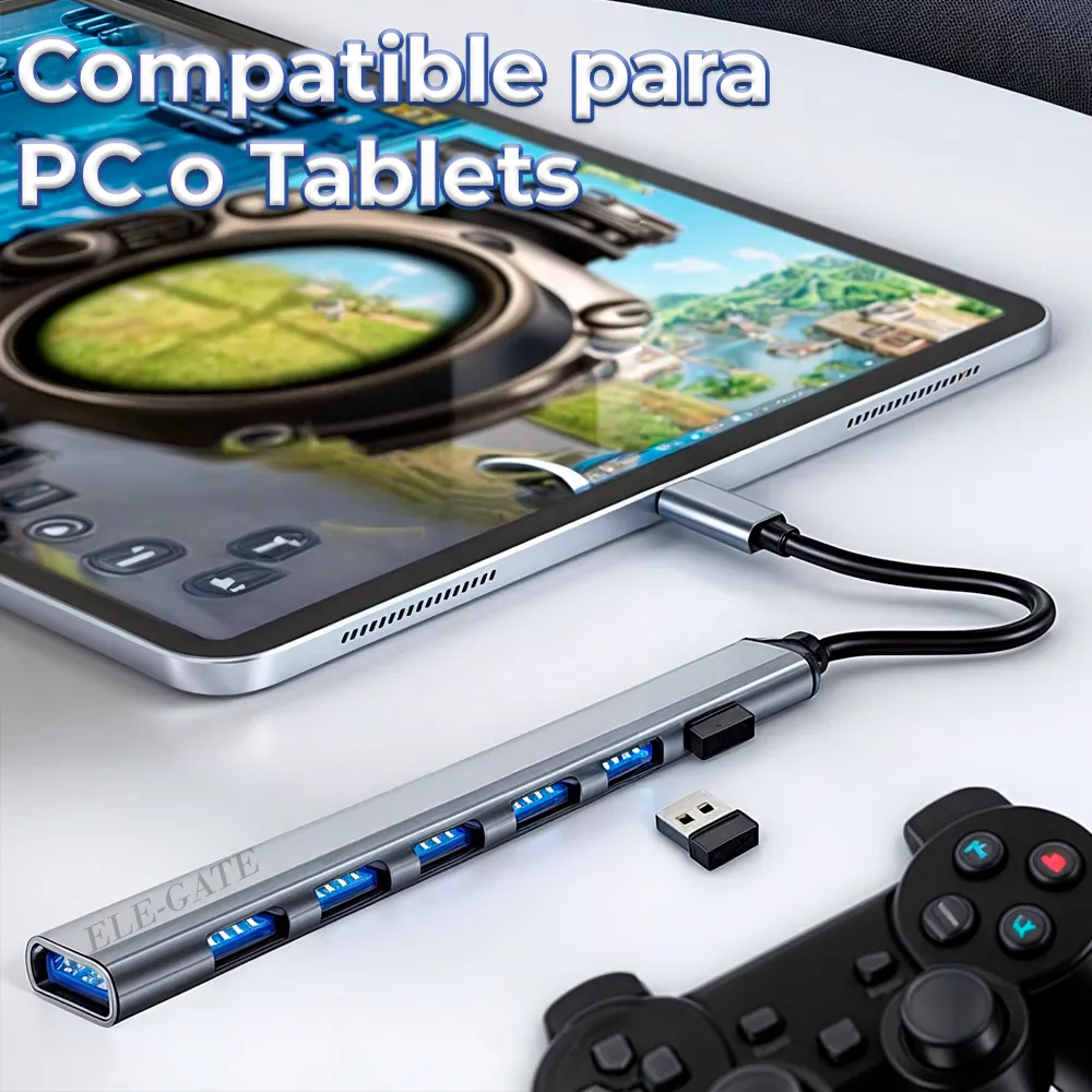 Multi Puerto 7 en 1 con 1 Puerto USB 3.0 y USB C, 7 puerto USB 3.0 Es compatible con una variedad de dispositivos. Como unidades flash USB, impresoras, lectores de tarjetas, ratones, teclados y discos duros. Ideal para ampliar los puertos sin perder velocidad y calidad de datos.