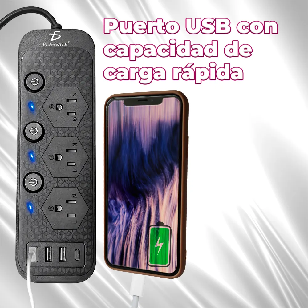 El Multicontacto de Alimentación Universal con 3 Clavijas, 3 Puertos USB y 1 Puerto Tipo C es la solución perfecta para aquellos que necesitan cargar varios dispositivos de manera eficiente y segura. Con su capacidad de carga rápida y su diseño compacto, es ideal para el hogar, la oficina o para llevar en tus viajes.